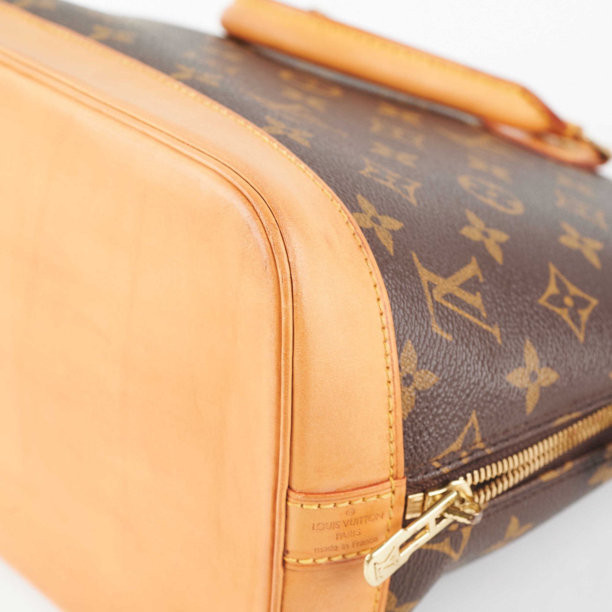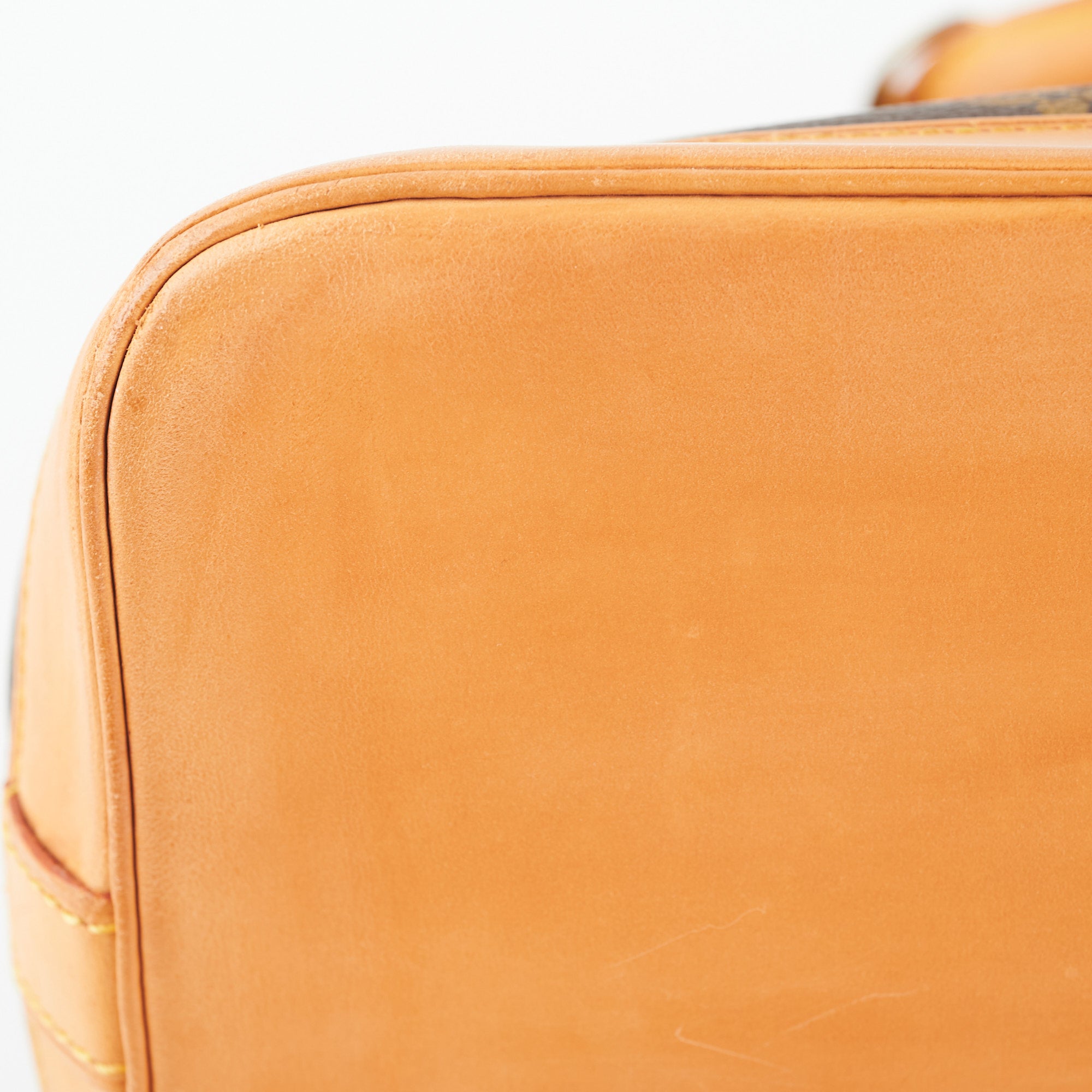 Darken vachetta leather, damage on the bottom of handle, tarnishing on hadrware, structure intact