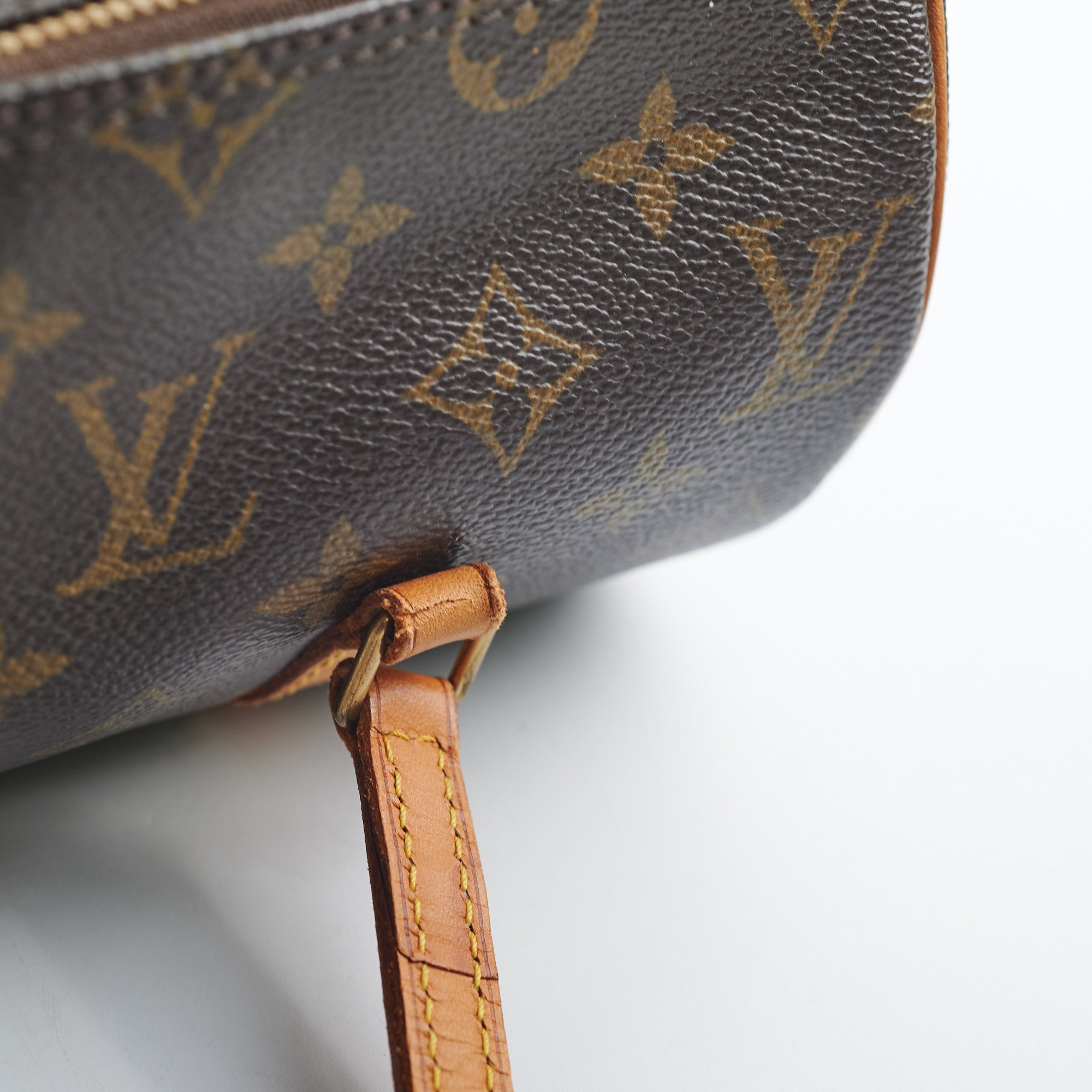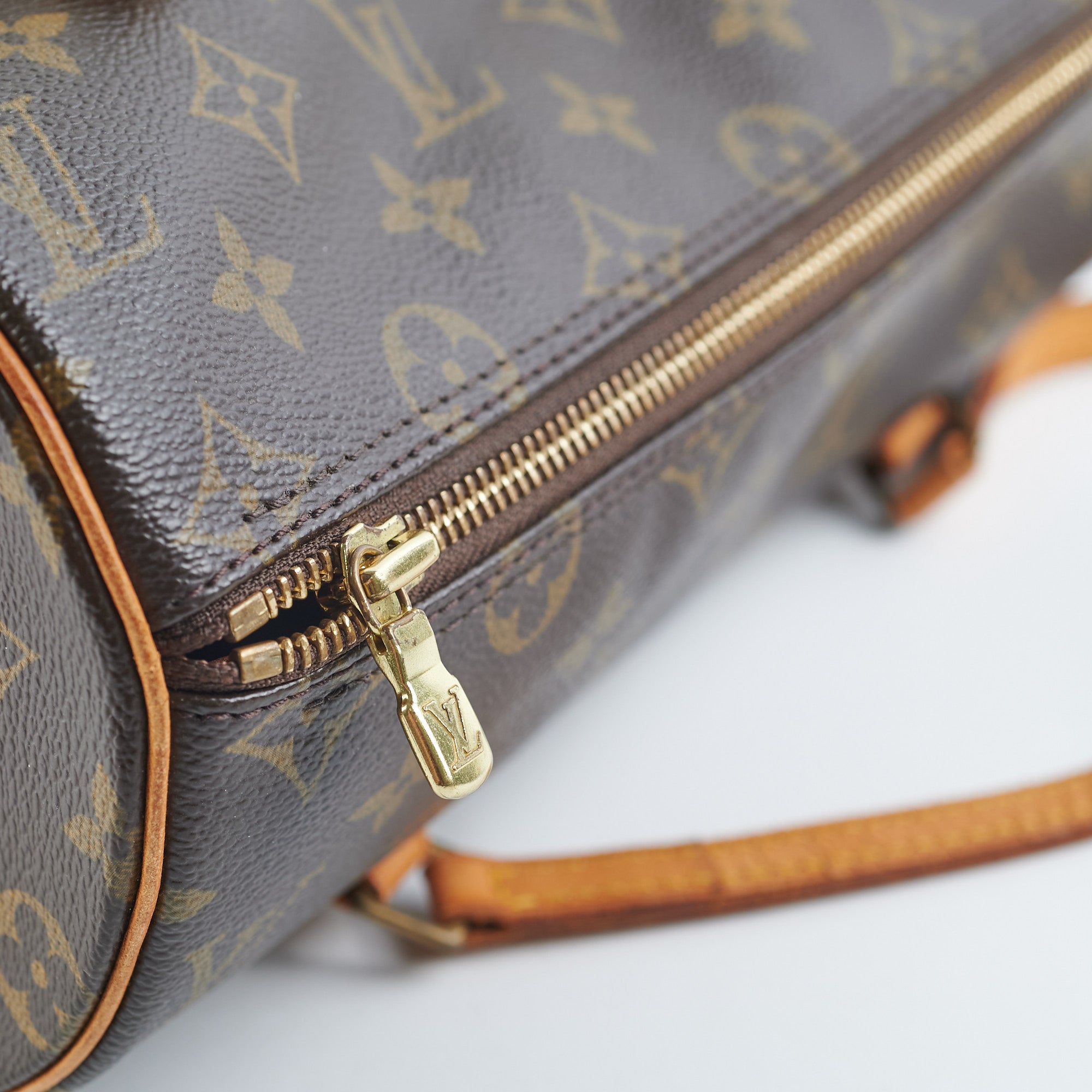 Vachette leather darken, cracking on handle leather, hairline scratches and tarnishing on zipper
