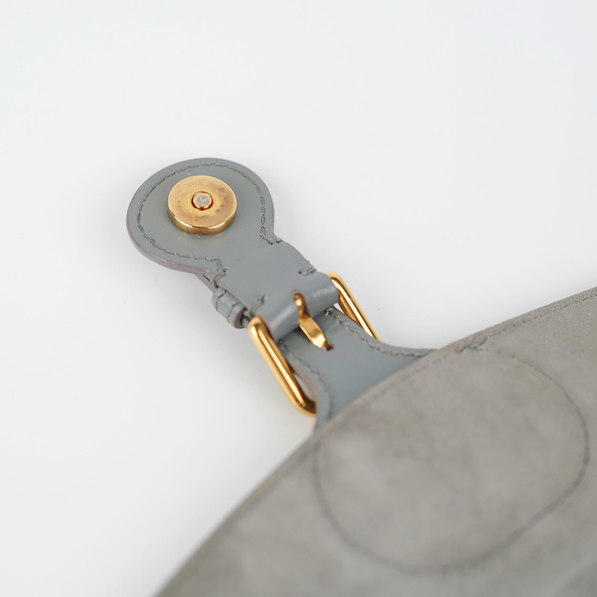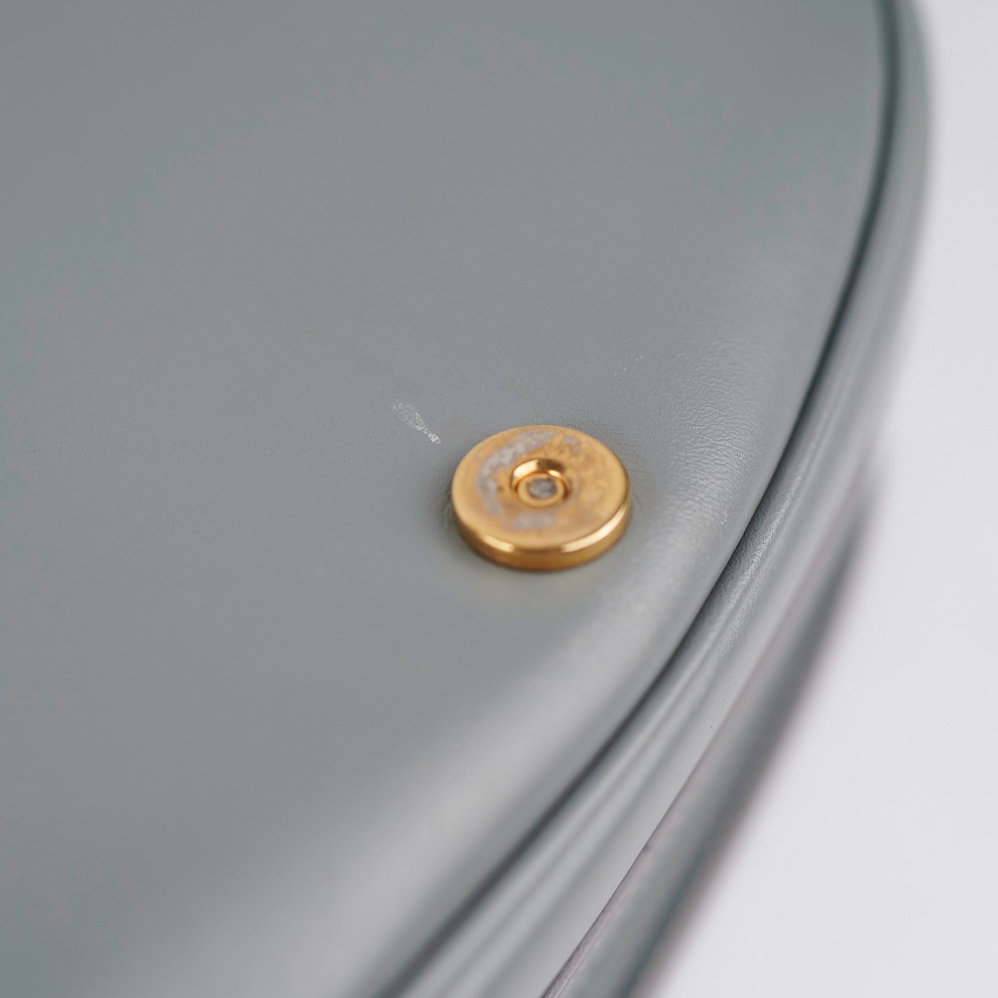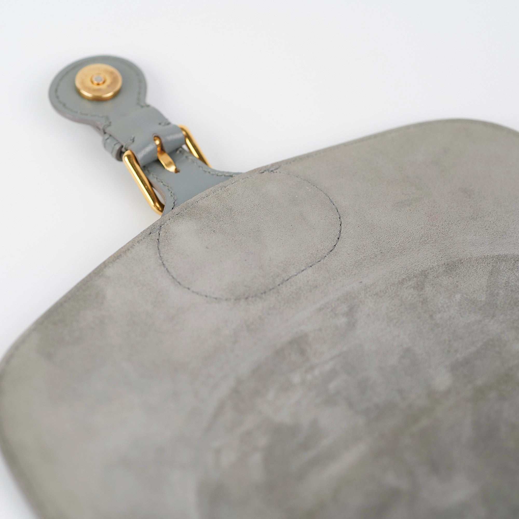 Light hairline scratches and tarnishing on hardware, nail marks throughout leather, light indent under opening closure