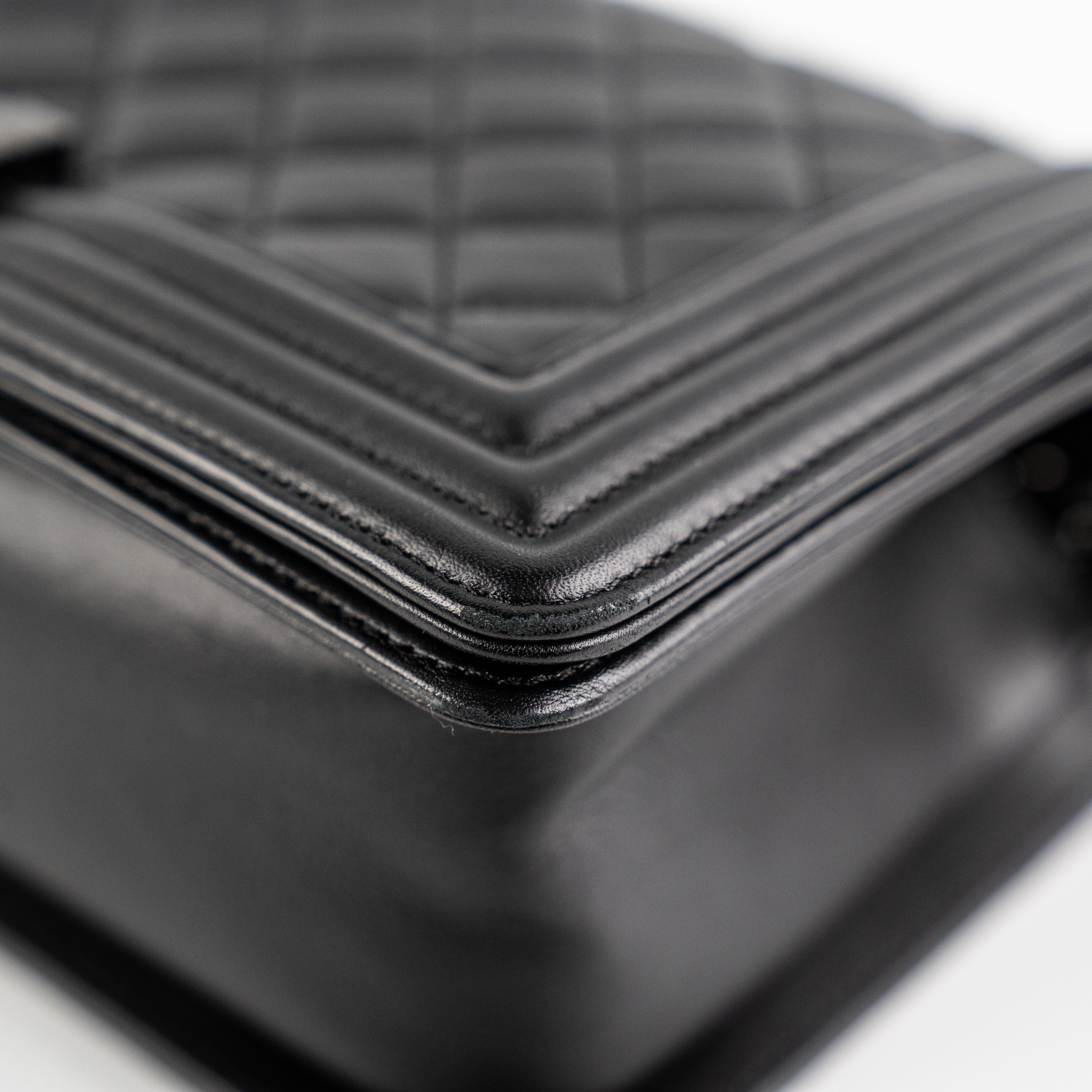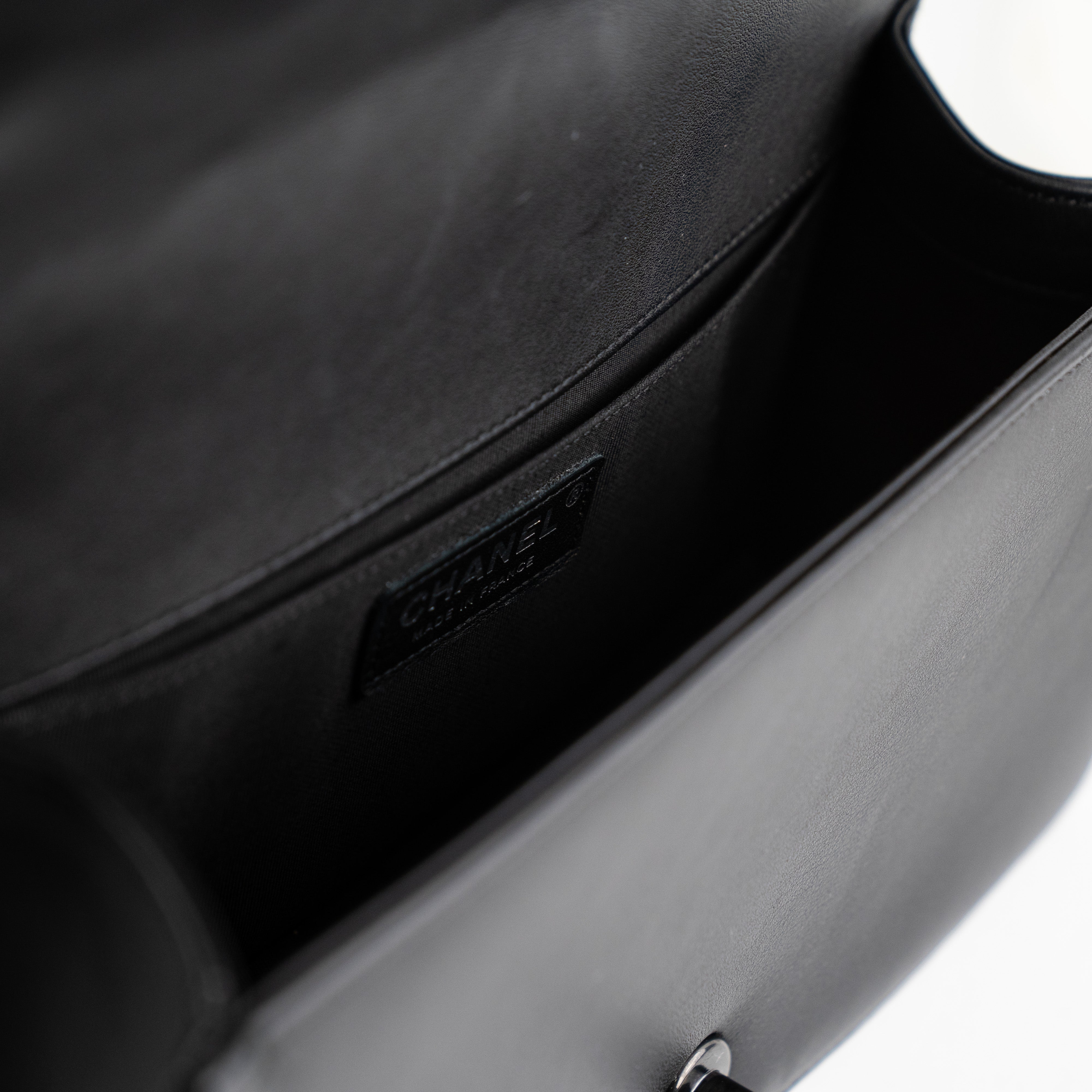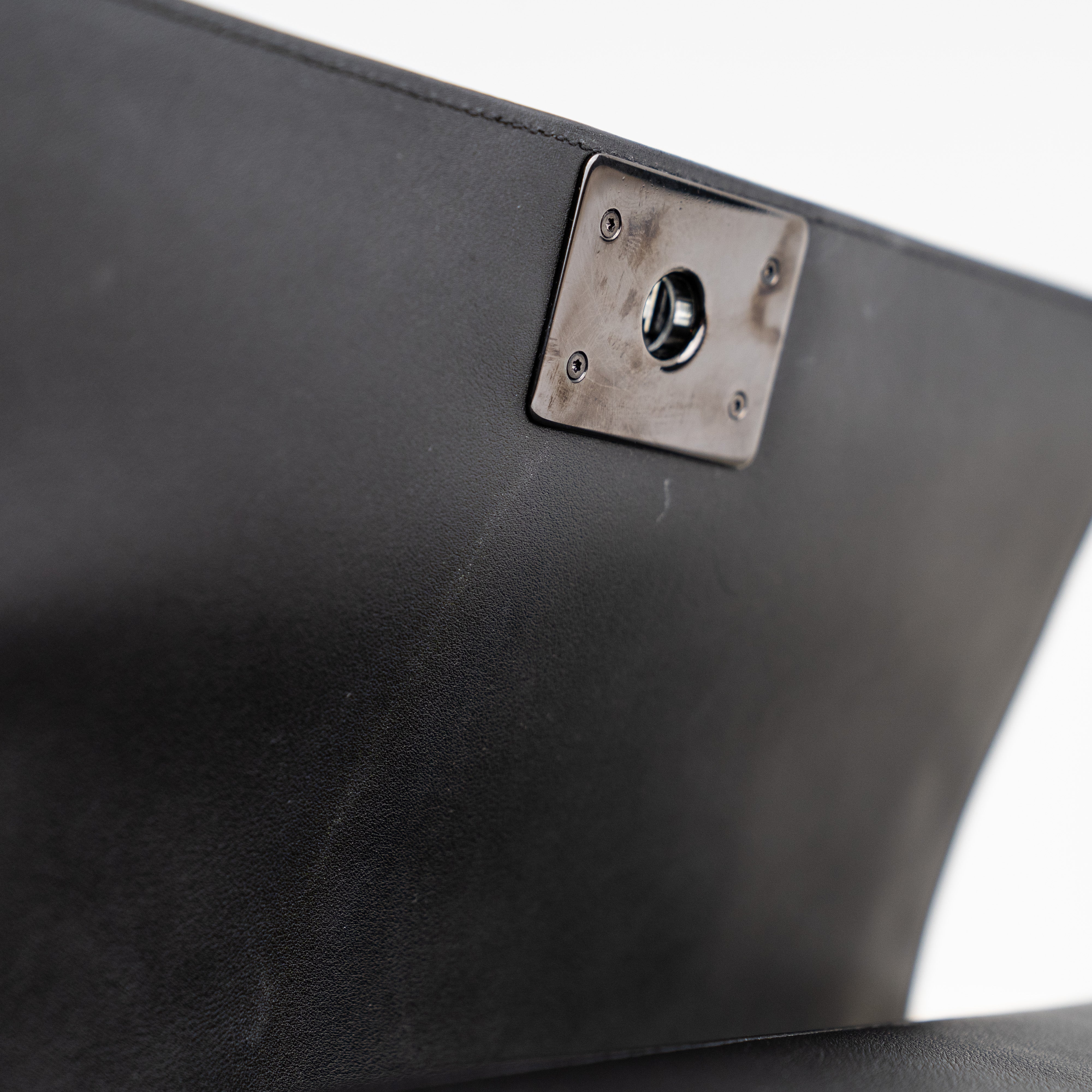 Light rubbing on corners, light scratches on hardware, light indent under flap, minor stain on interior