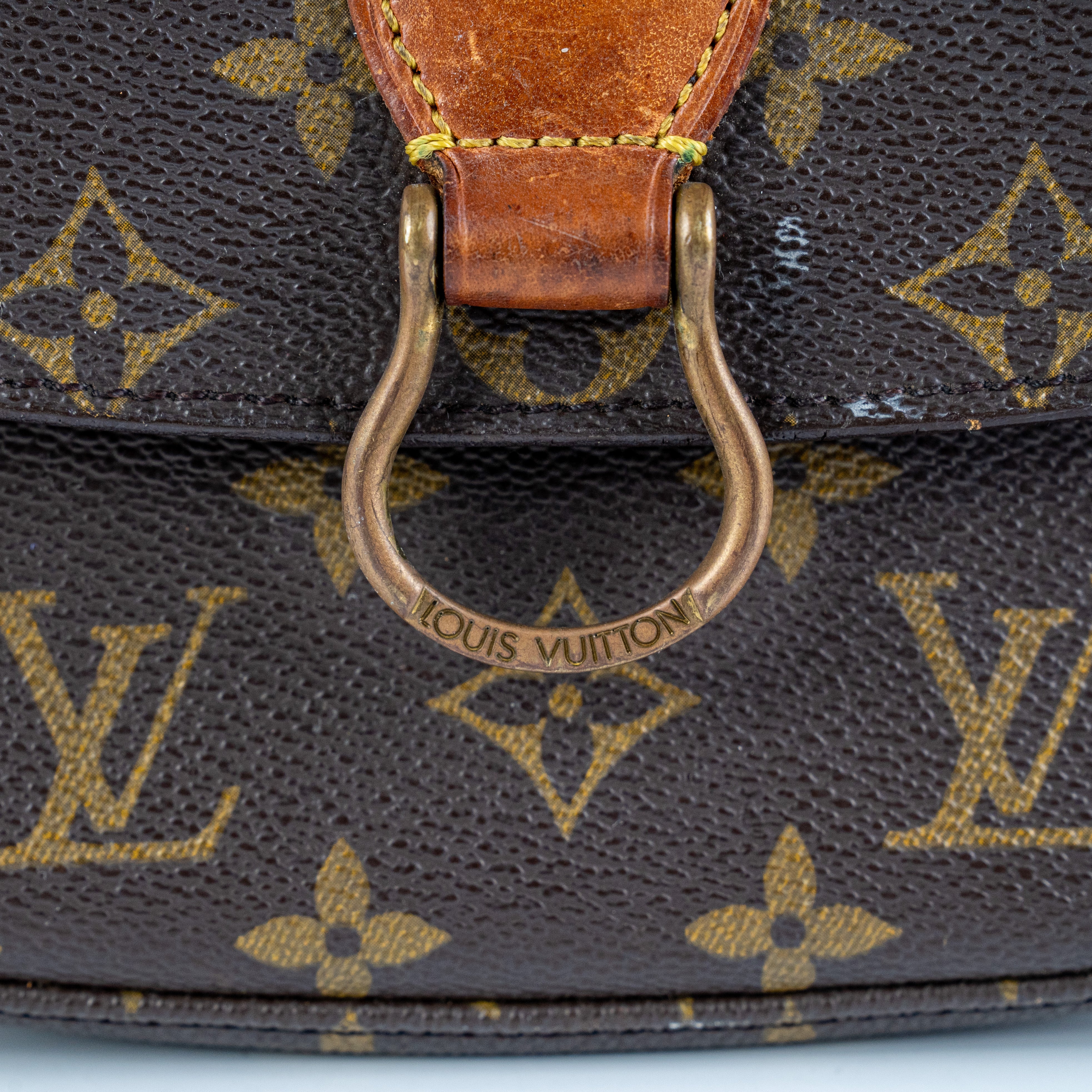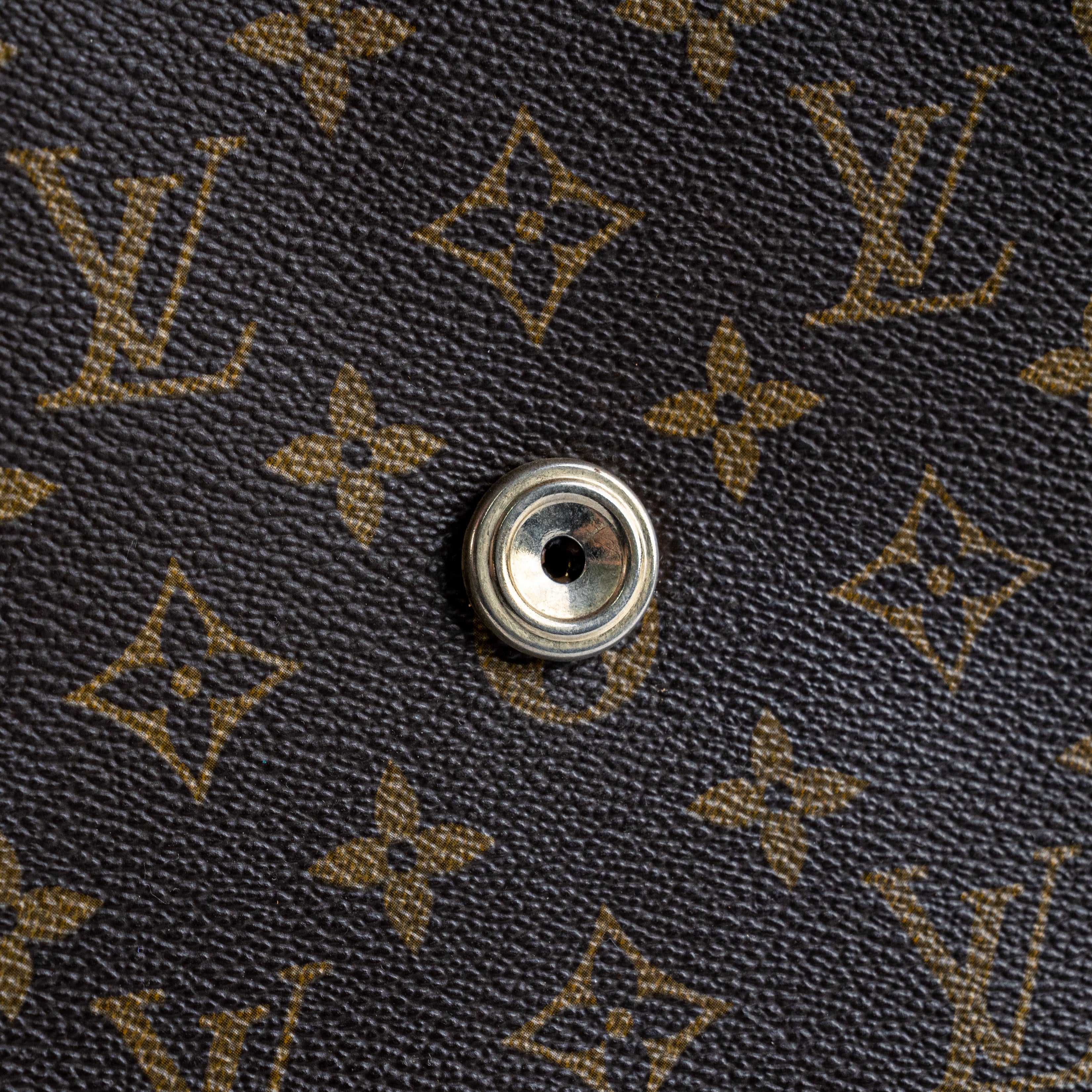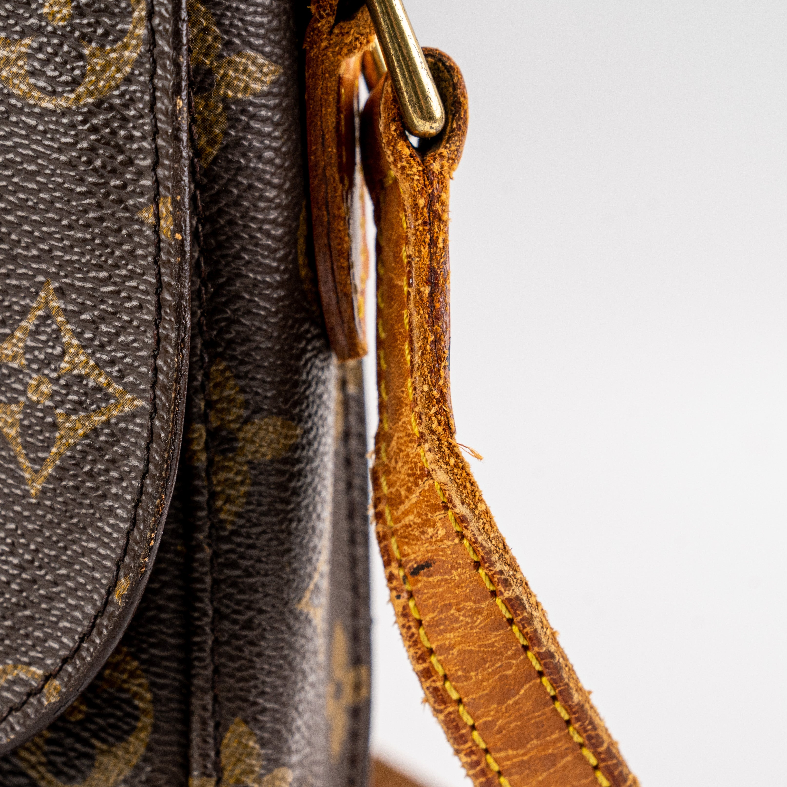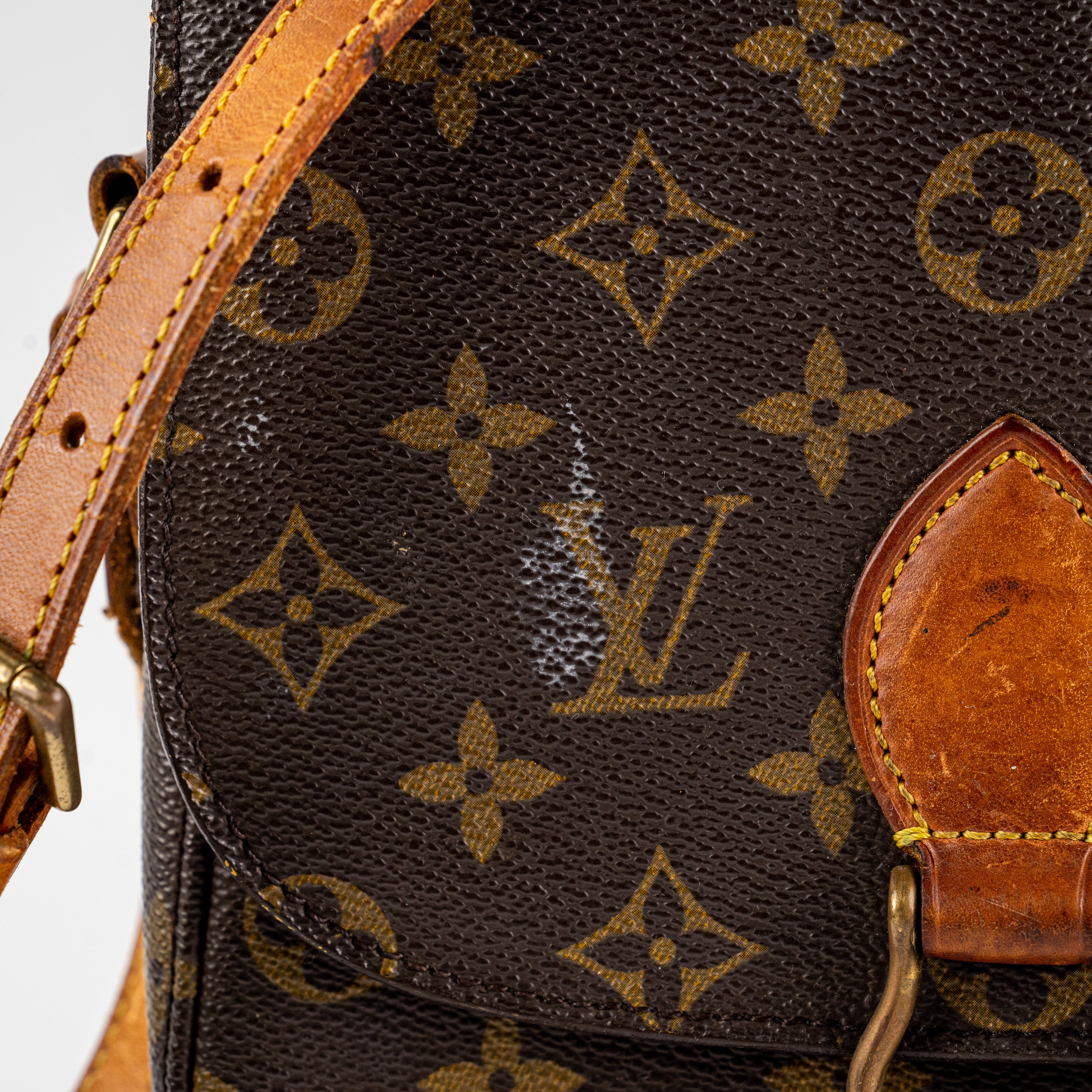 Signs of wear throughout, marks and stains on canvas and under flap, light hairline scratches and tarnishing on hardware, minor rip near stitching under flap, darkened, rubbing and creasing on strap