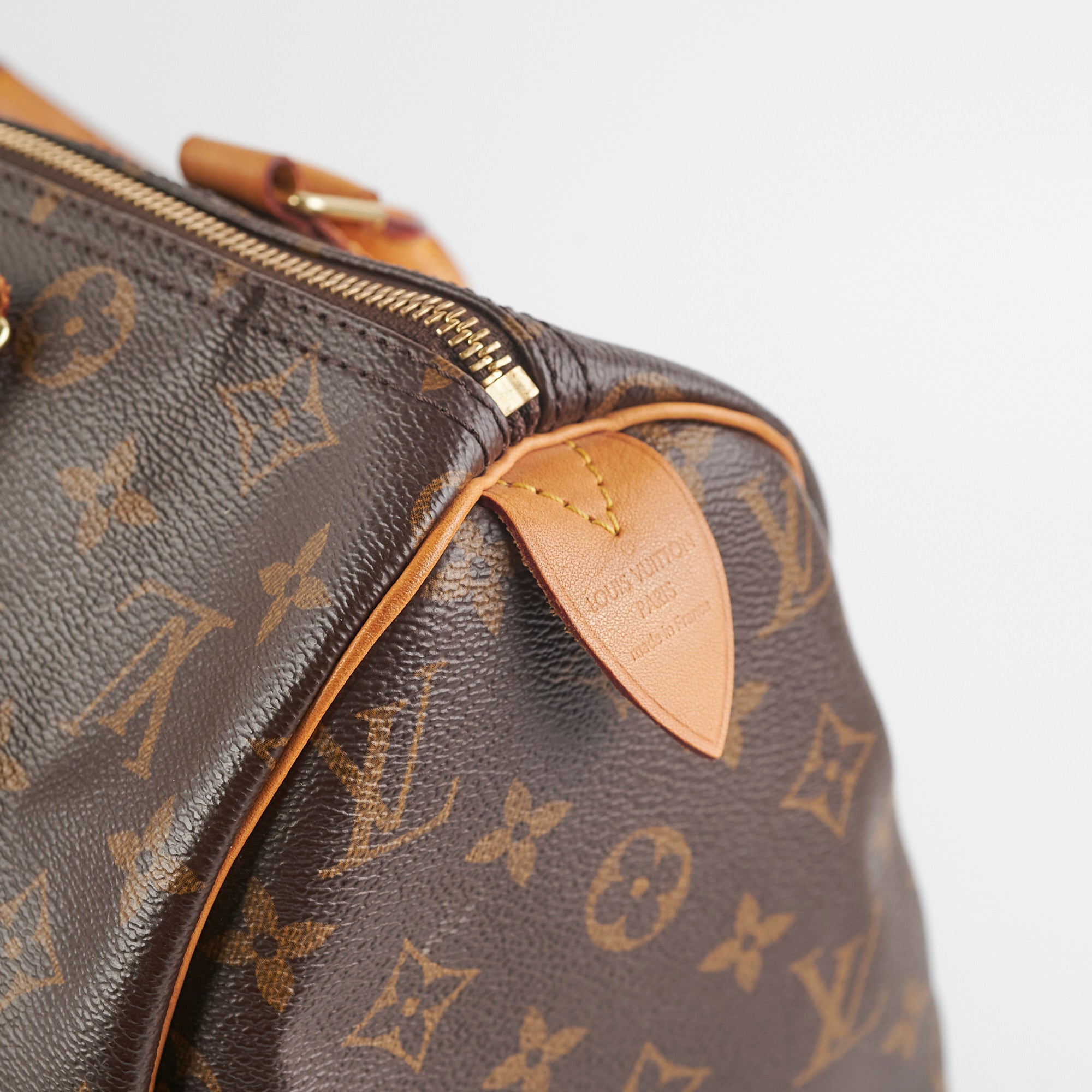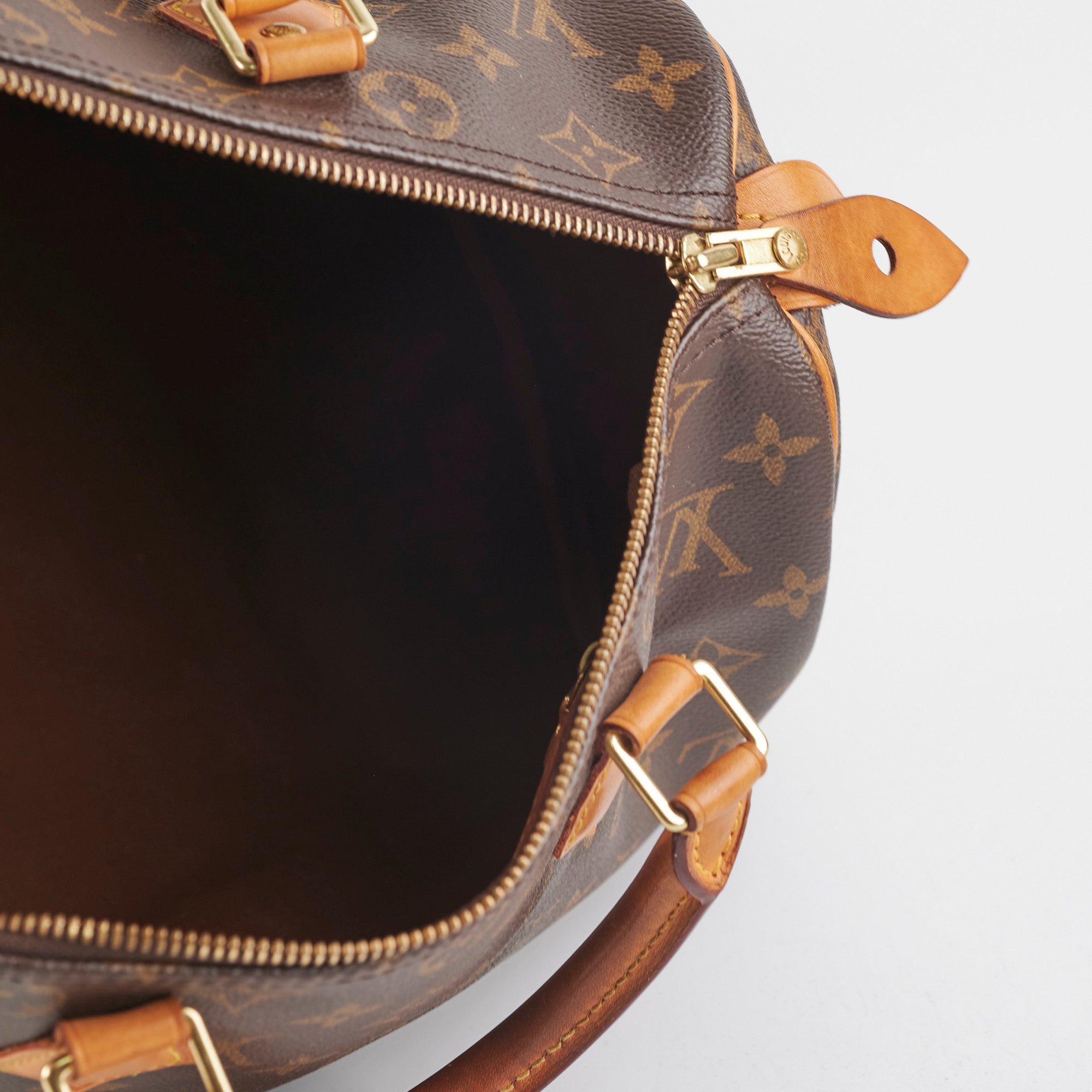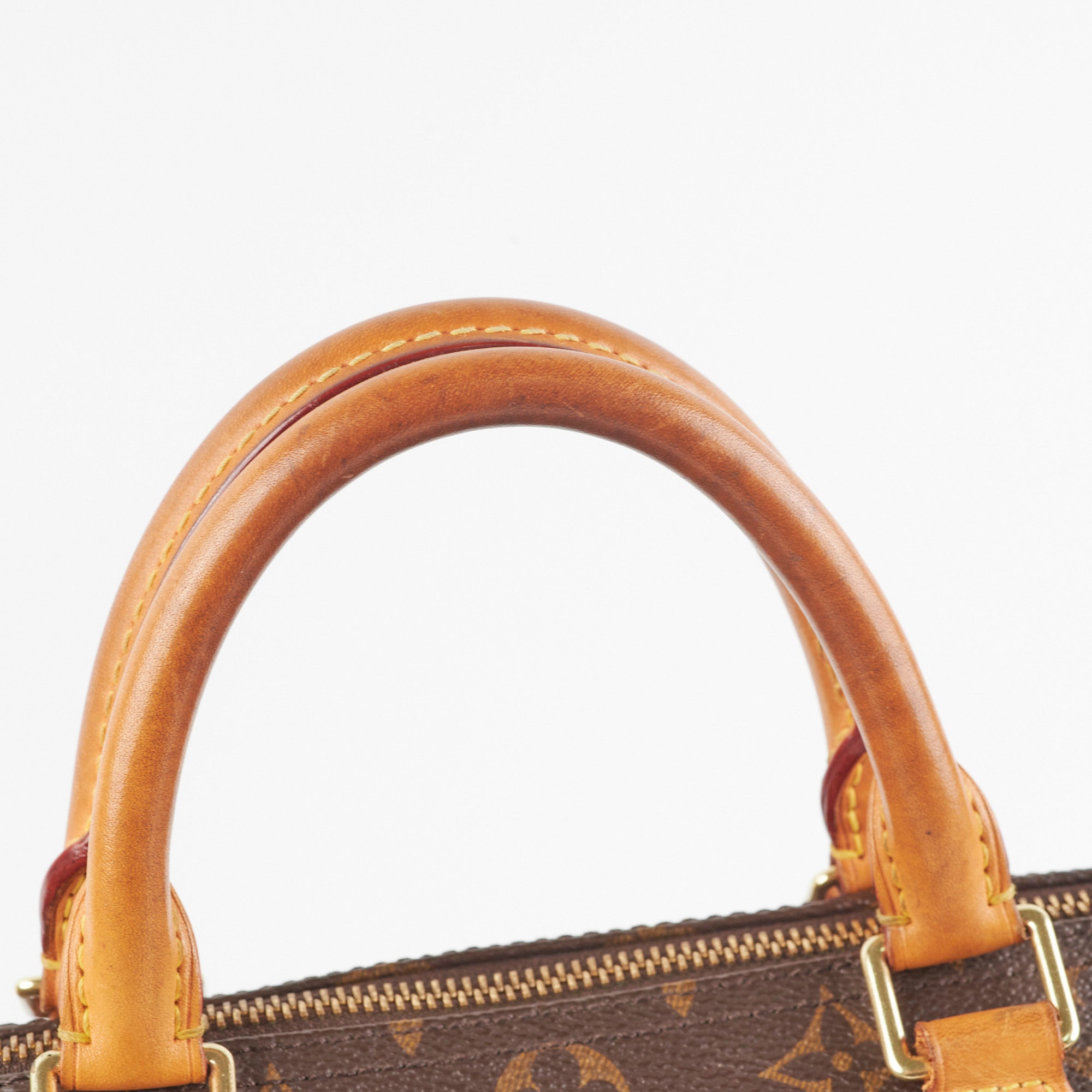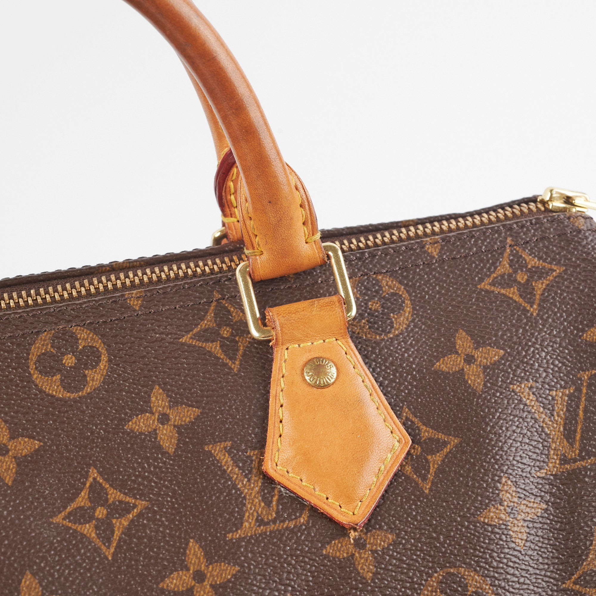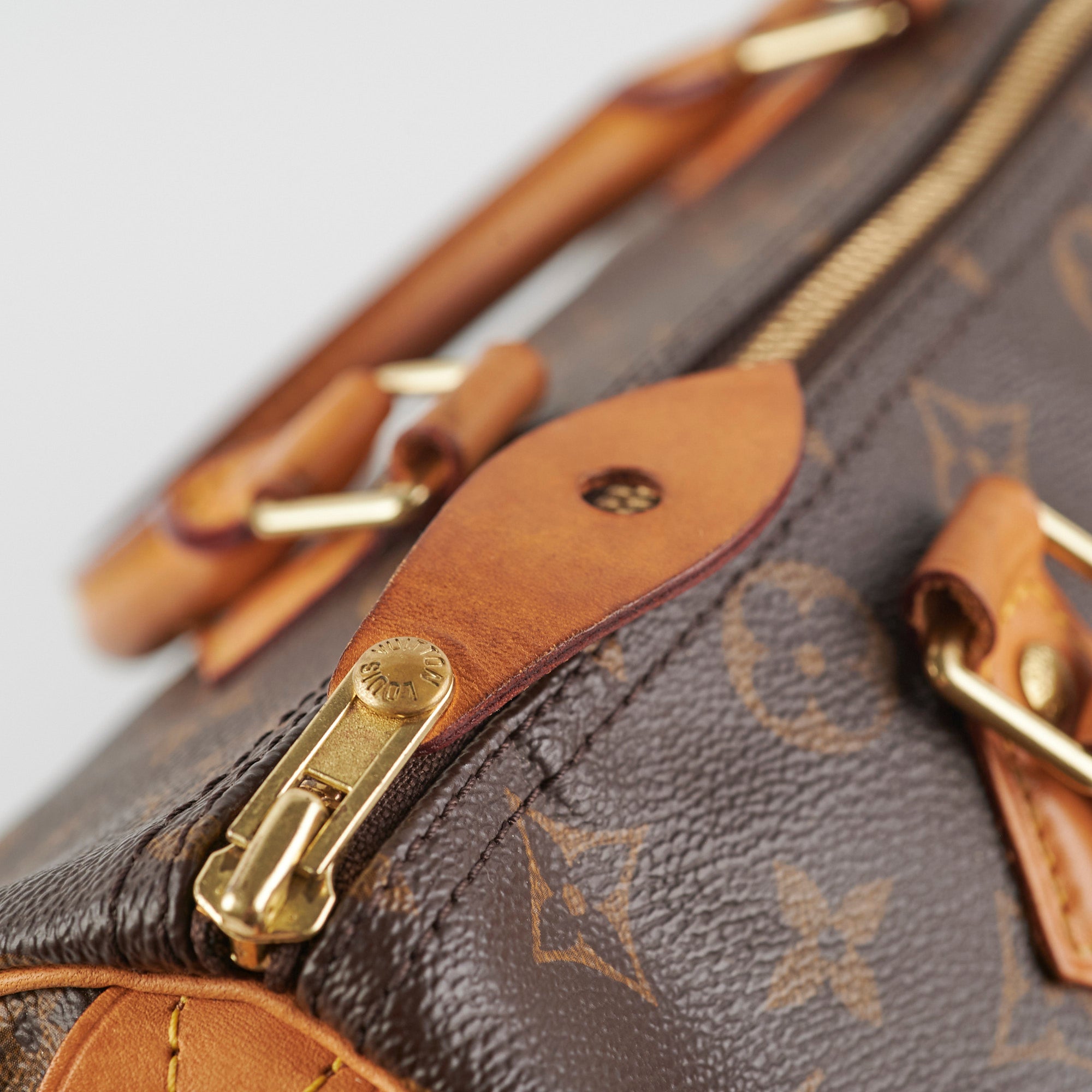 Signs of wear on vachetta (water marks and darkening), light hairline scratches and tarnishing on hardware, light rubbing on corners and edges, light stains on interior,