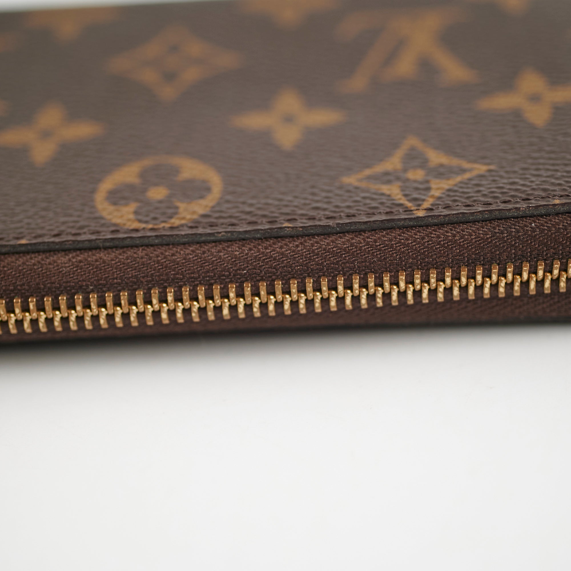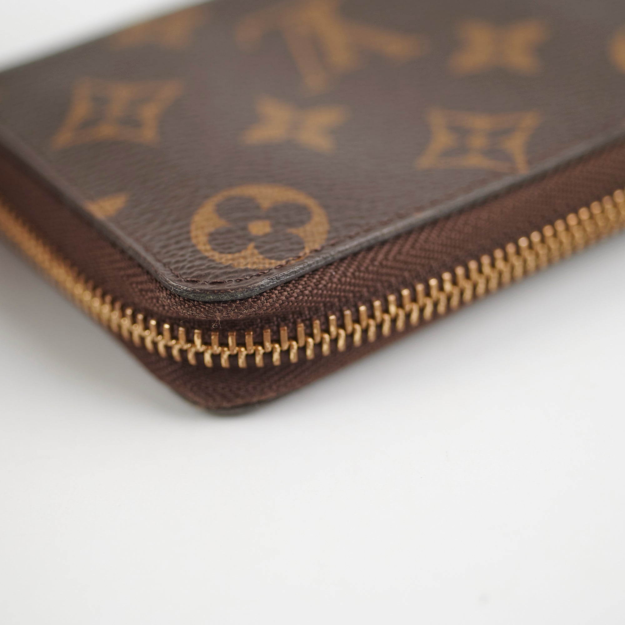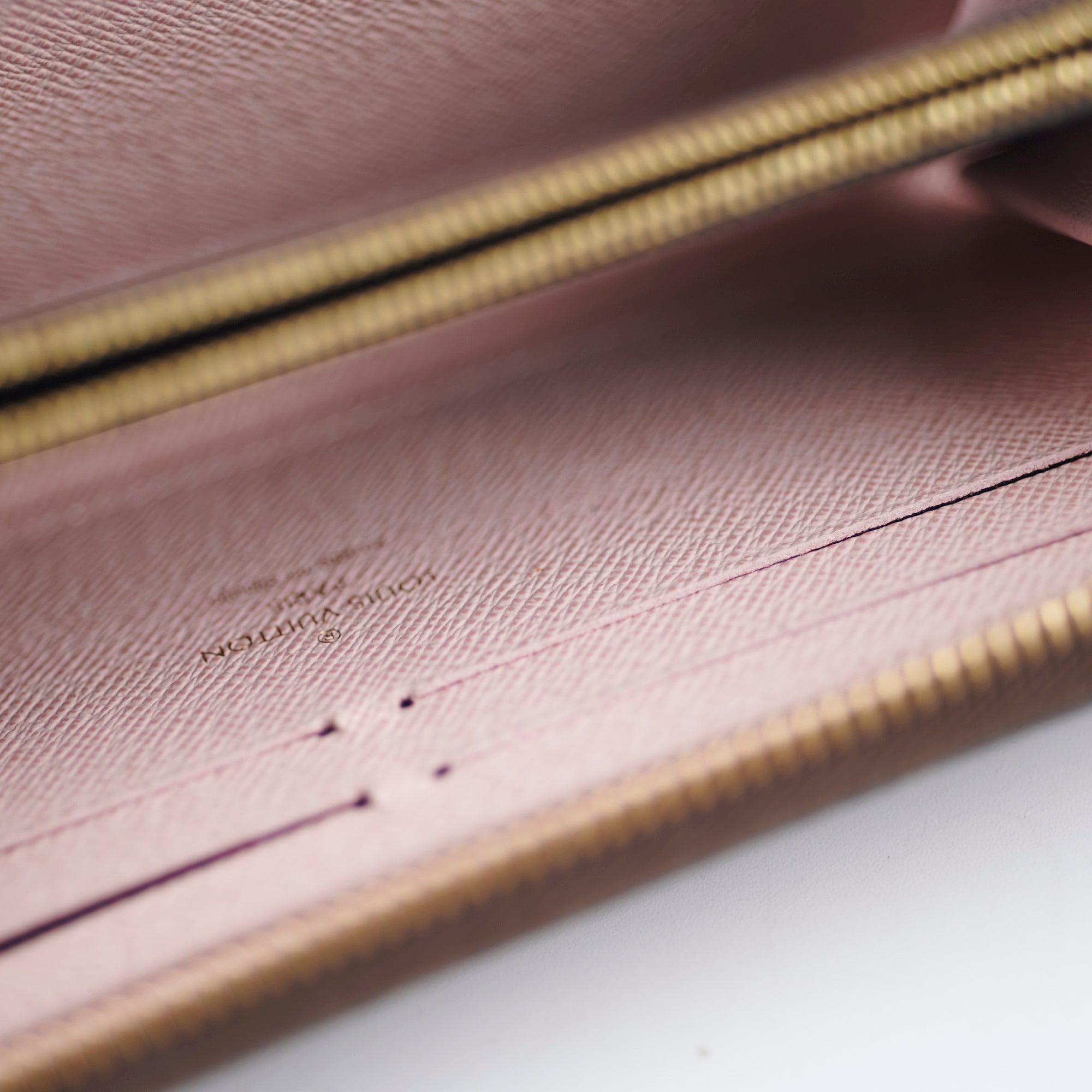Light tarnishing on hardware, flaw on zipper leather, stains interior