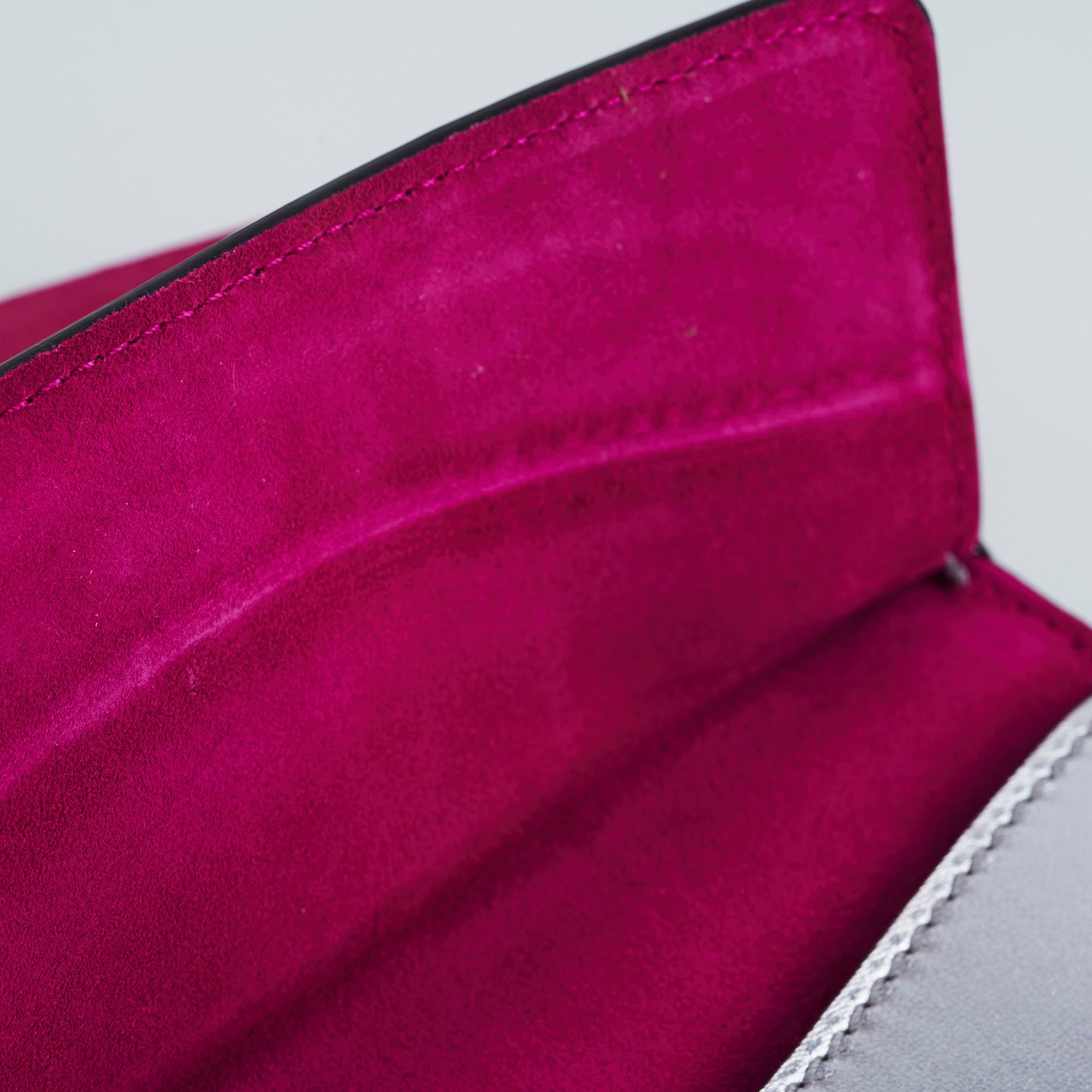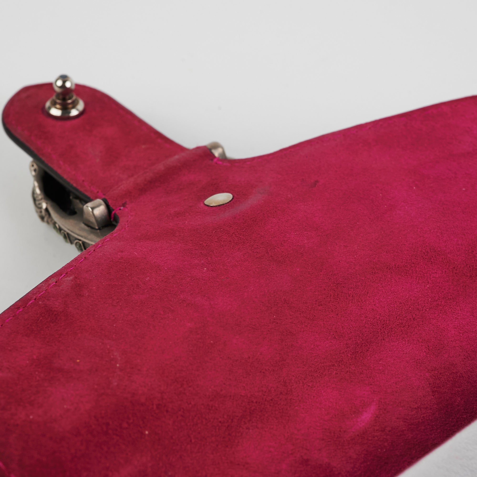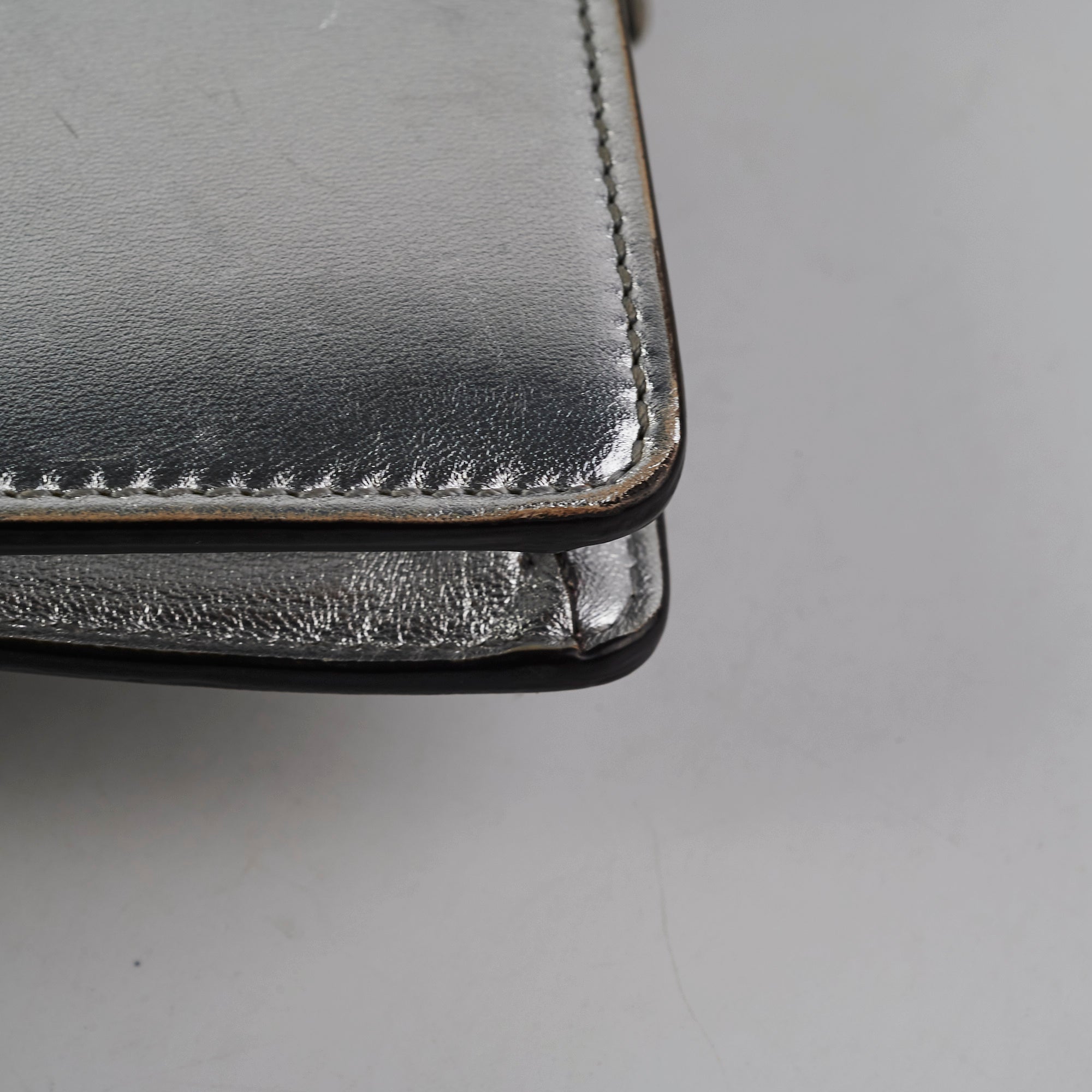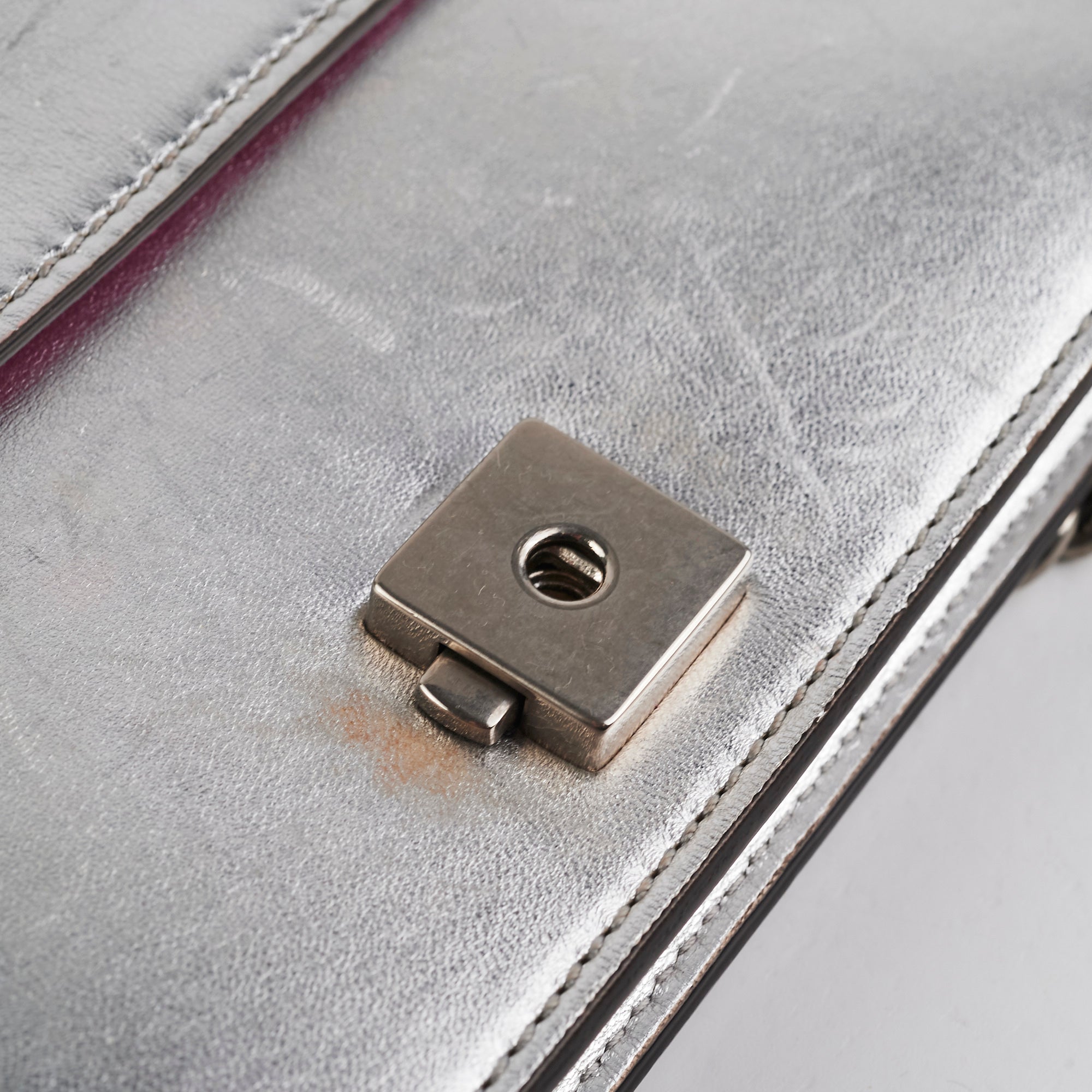 Light signs of wear throughout, nail marks on leather, rubbing on corners and around opening, softened structure, rubbing on interior lining, tarnishing on hardware