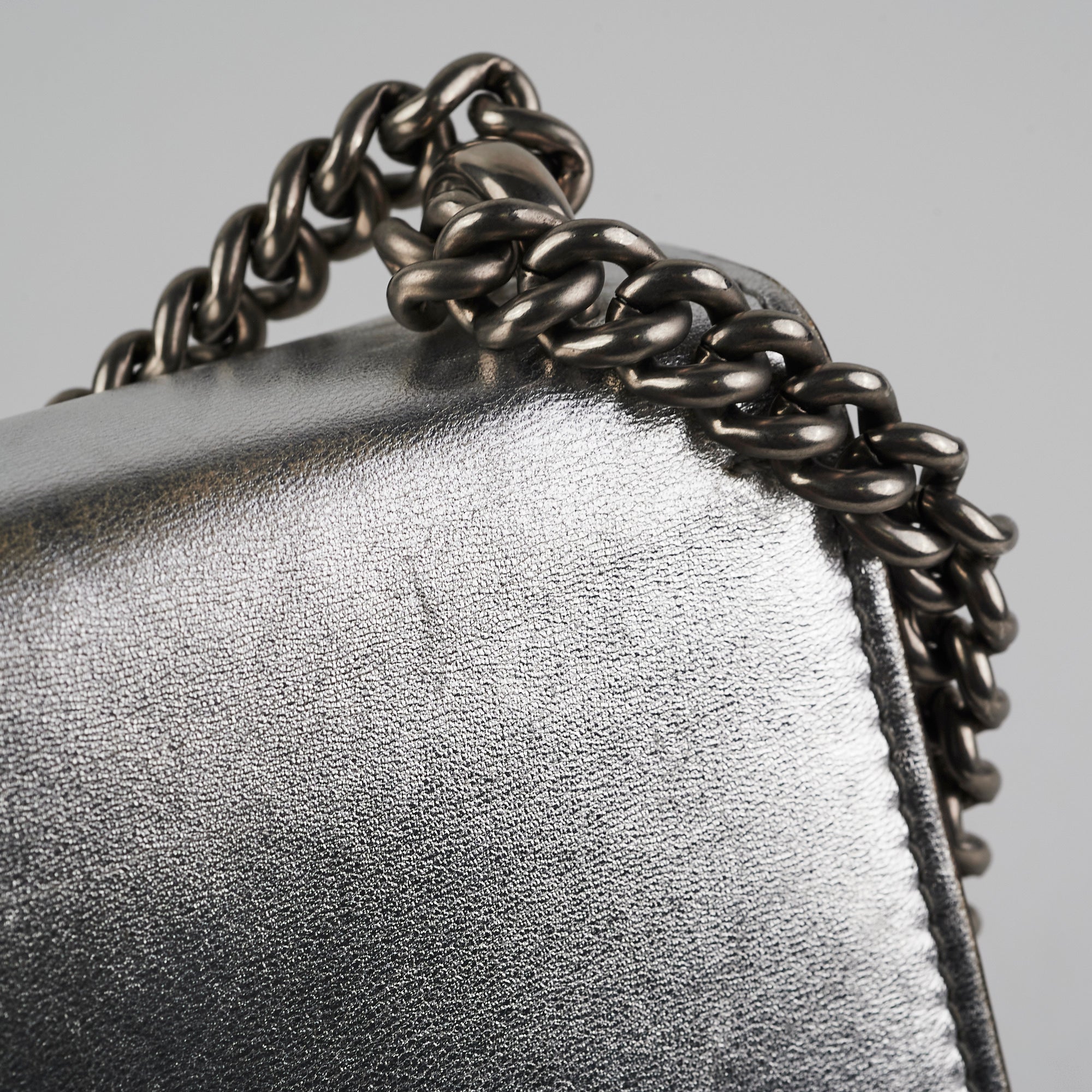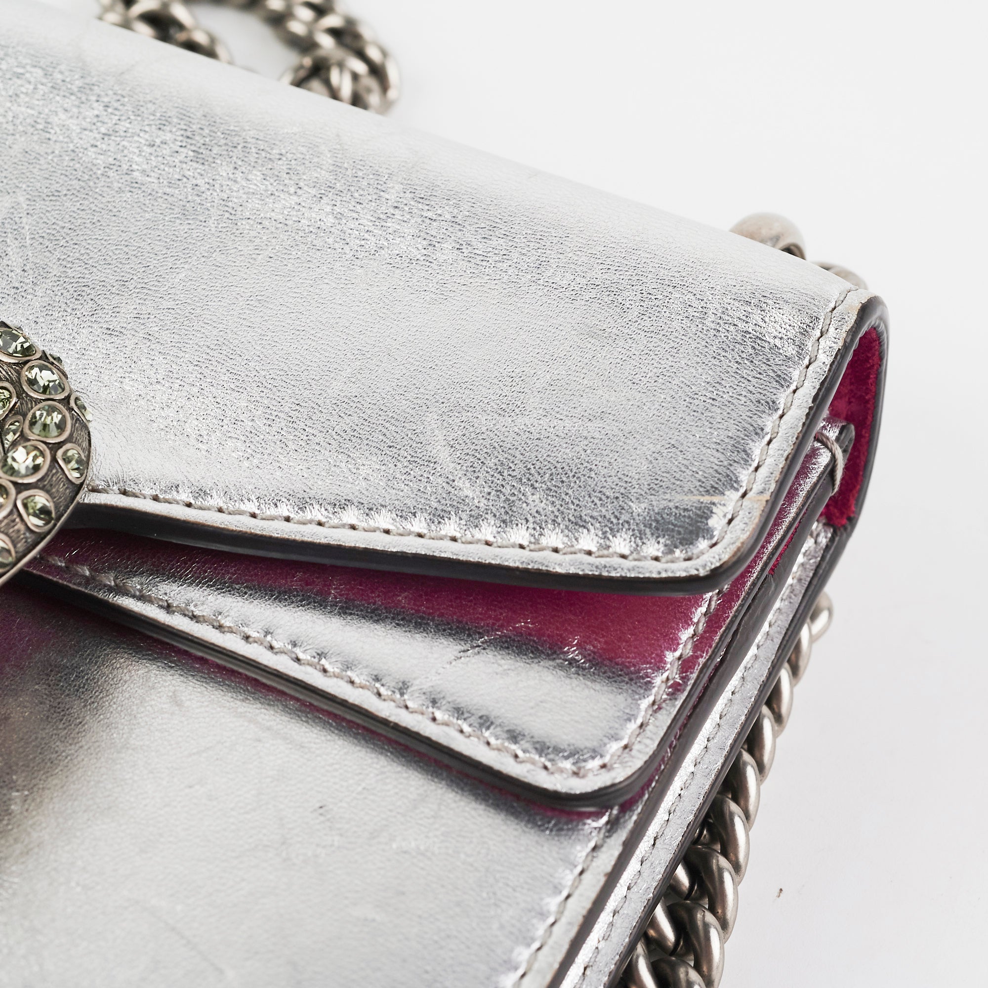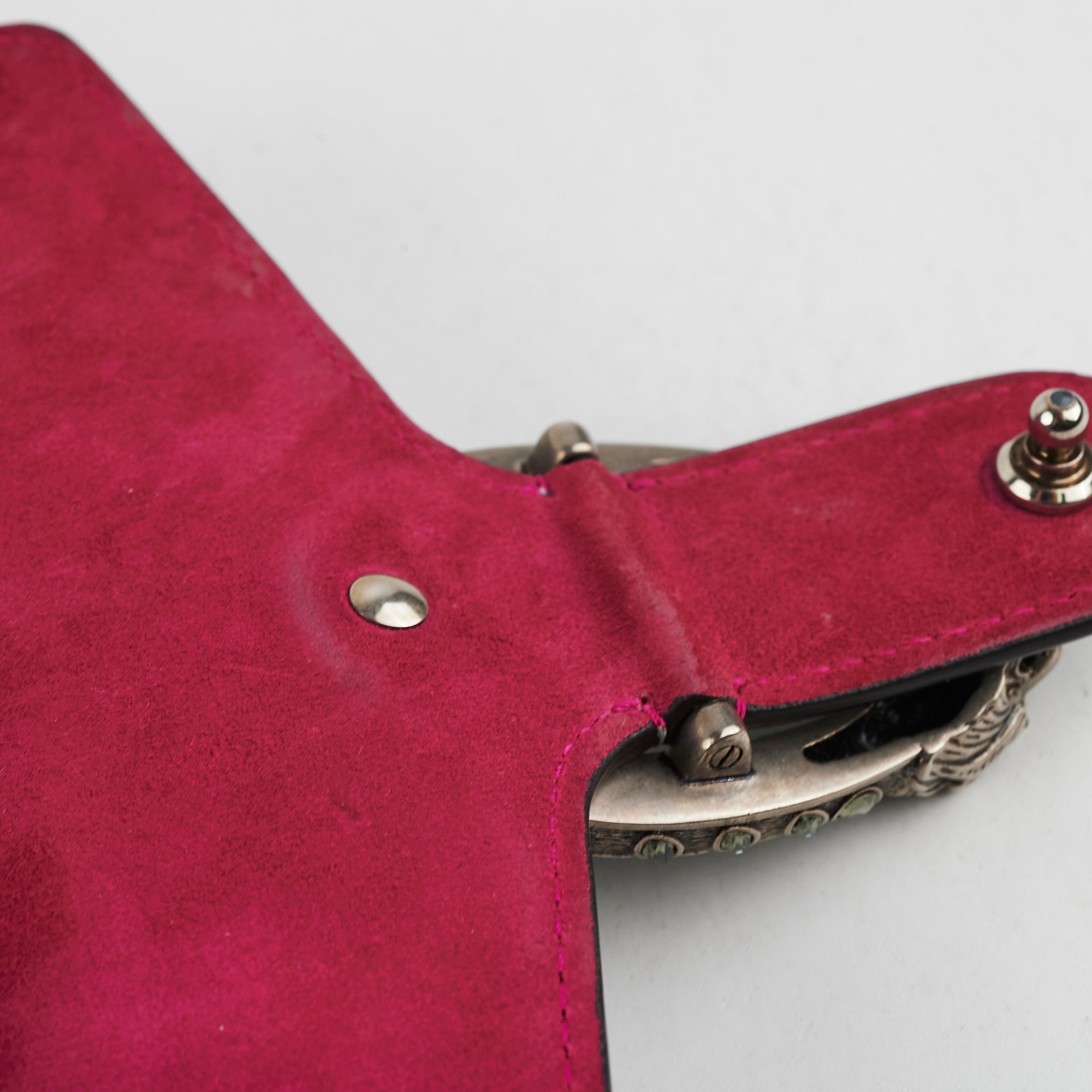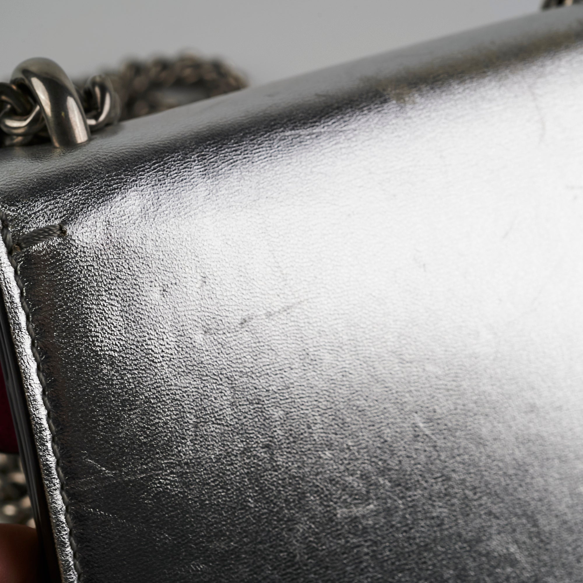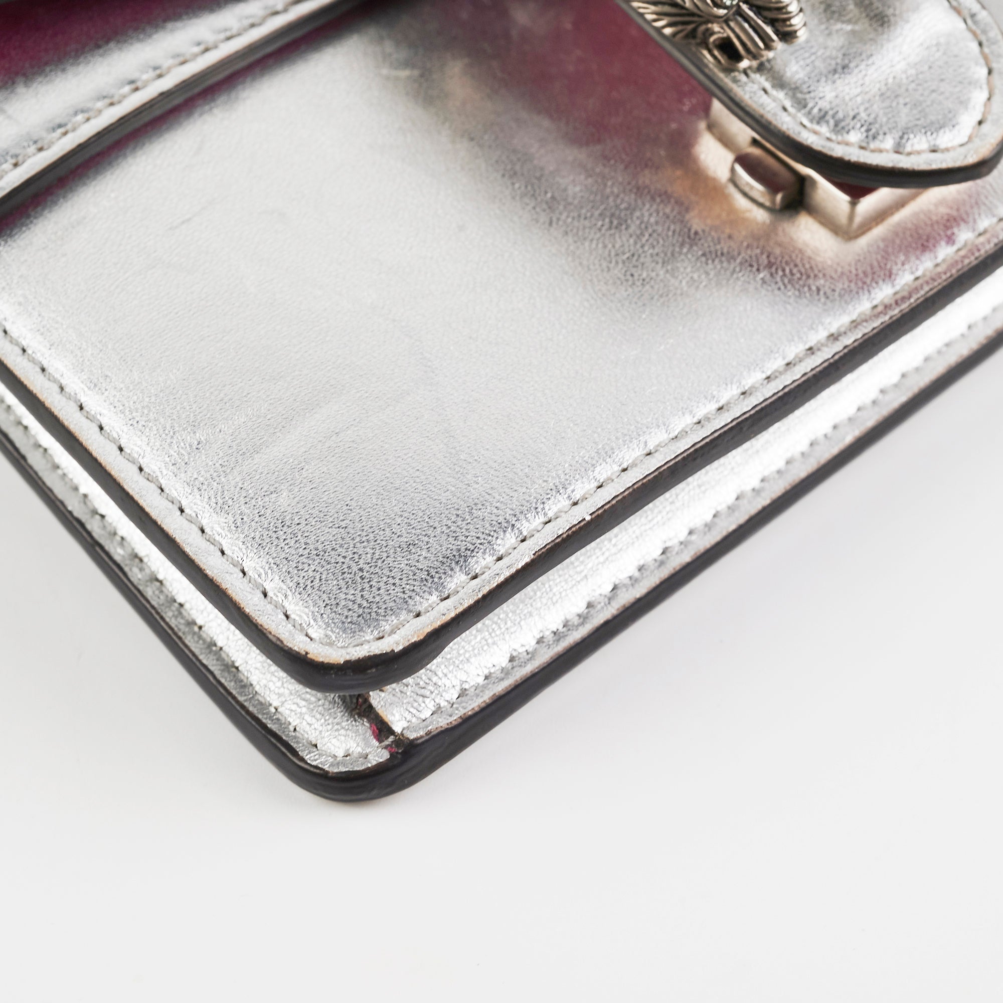 Light signs of wear throughout, nail marks on leather, rubbing on corners and around opening, softened structure, rubbing on interior lining, tarnishing on hardware
