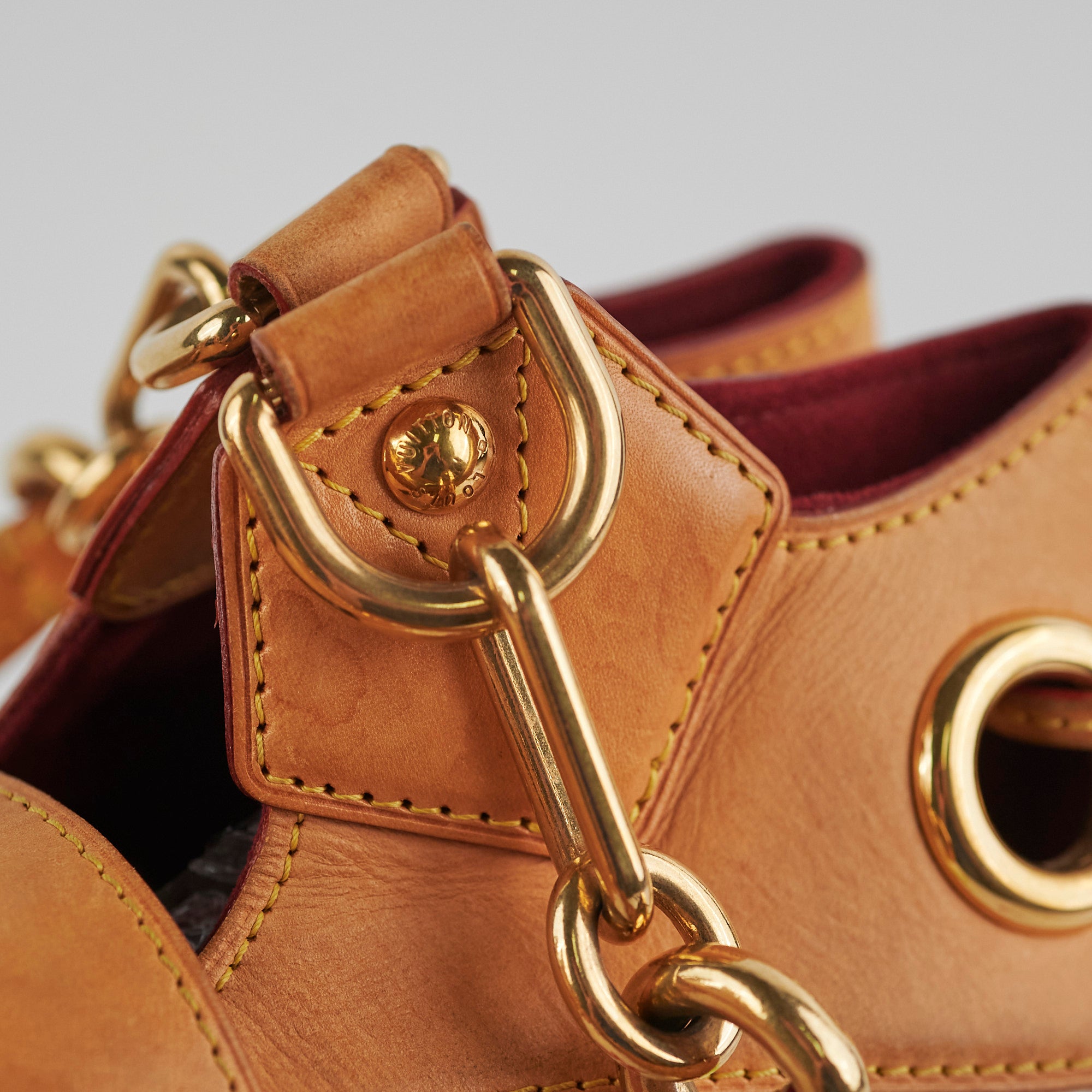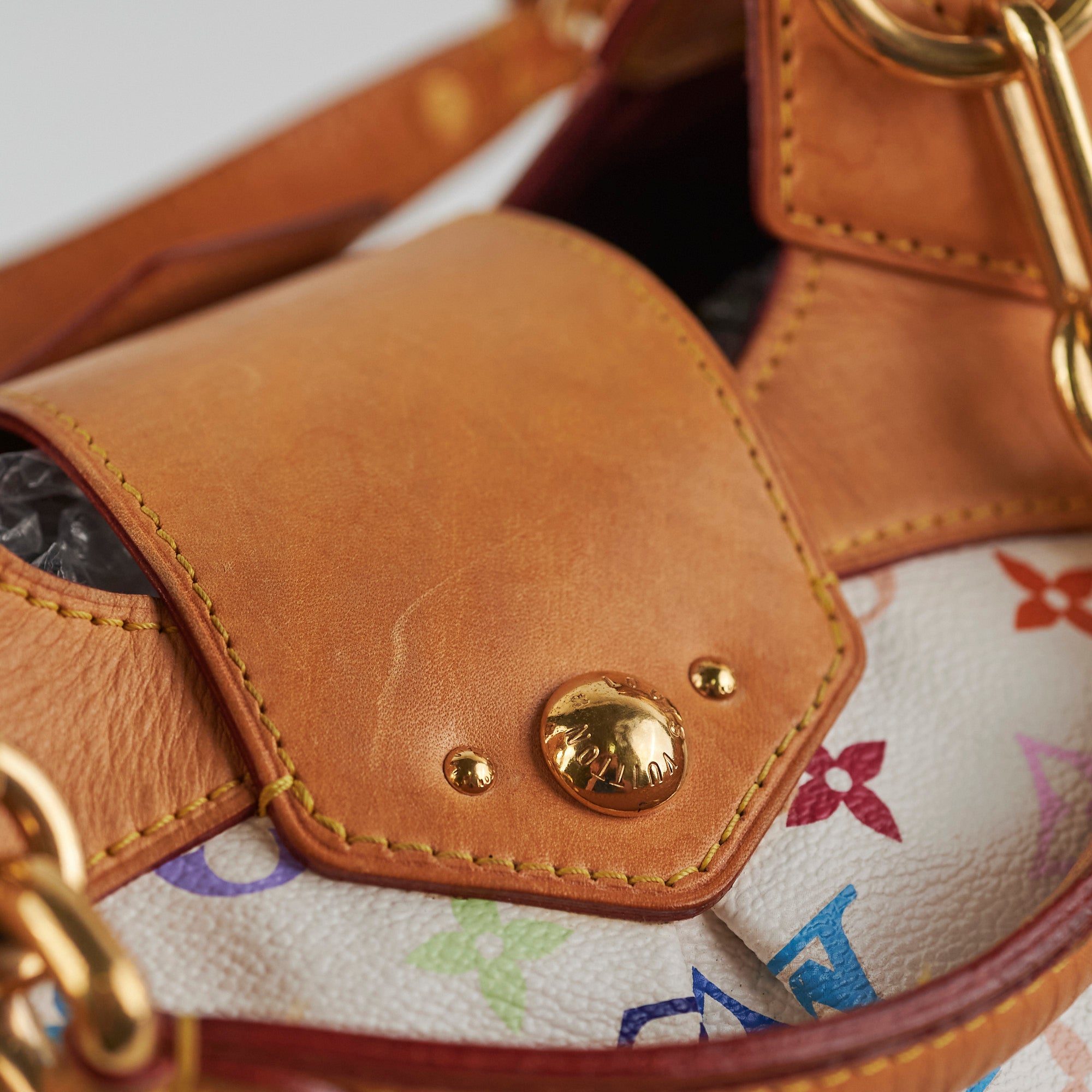 Signs of wear throughout, darkening and watermark on vachetta leather, rubbing on corners, scratches on hardware