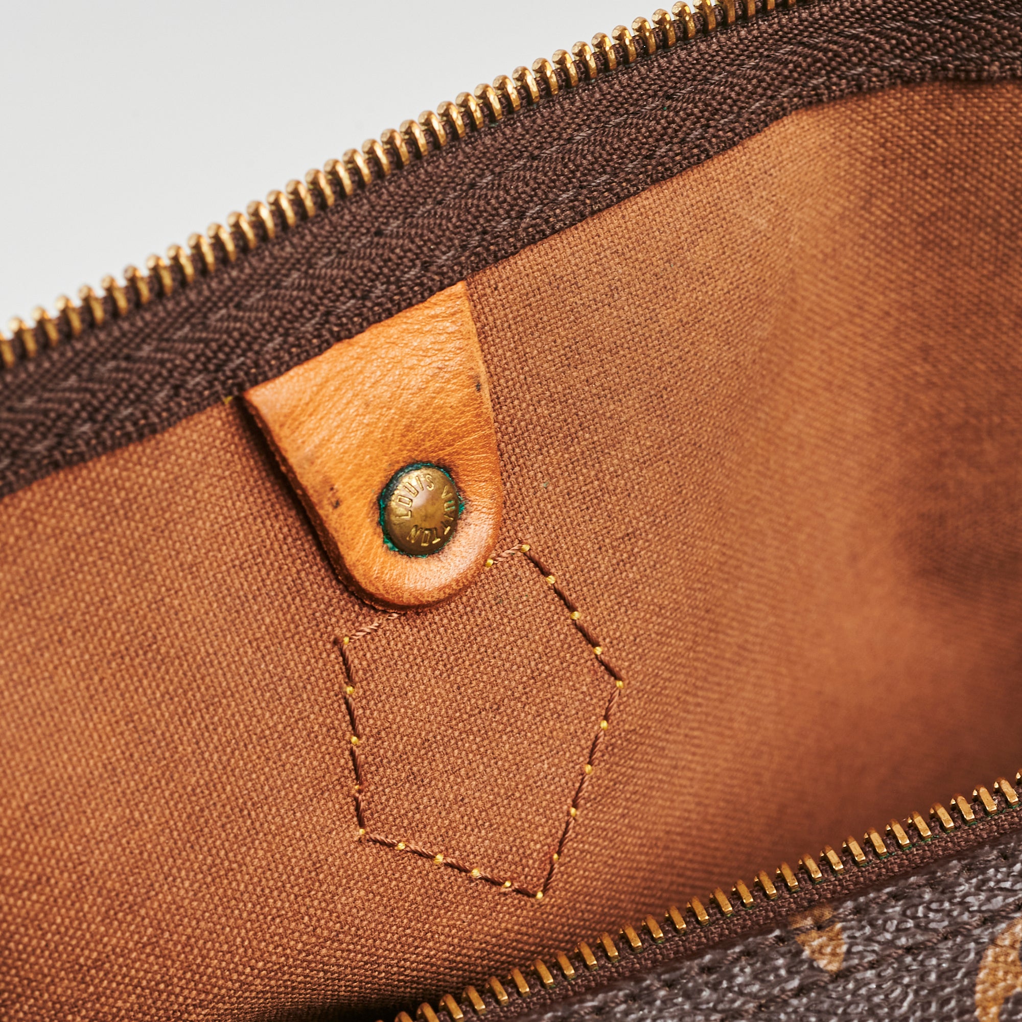 General sign of wear throughout, darkening, rubbing and marks on vachetta, tarnishing and scratches on hardware, light stain on interior pocket