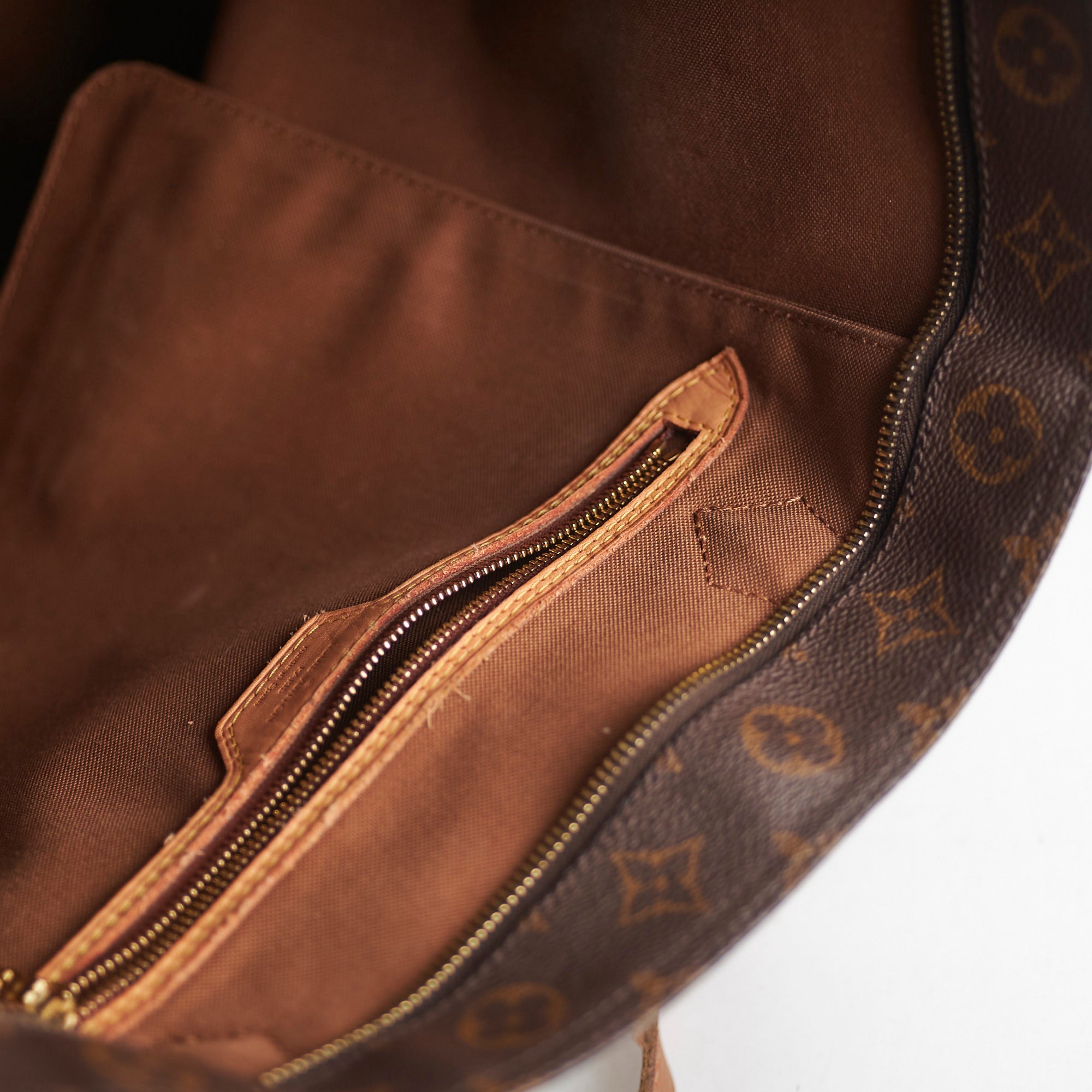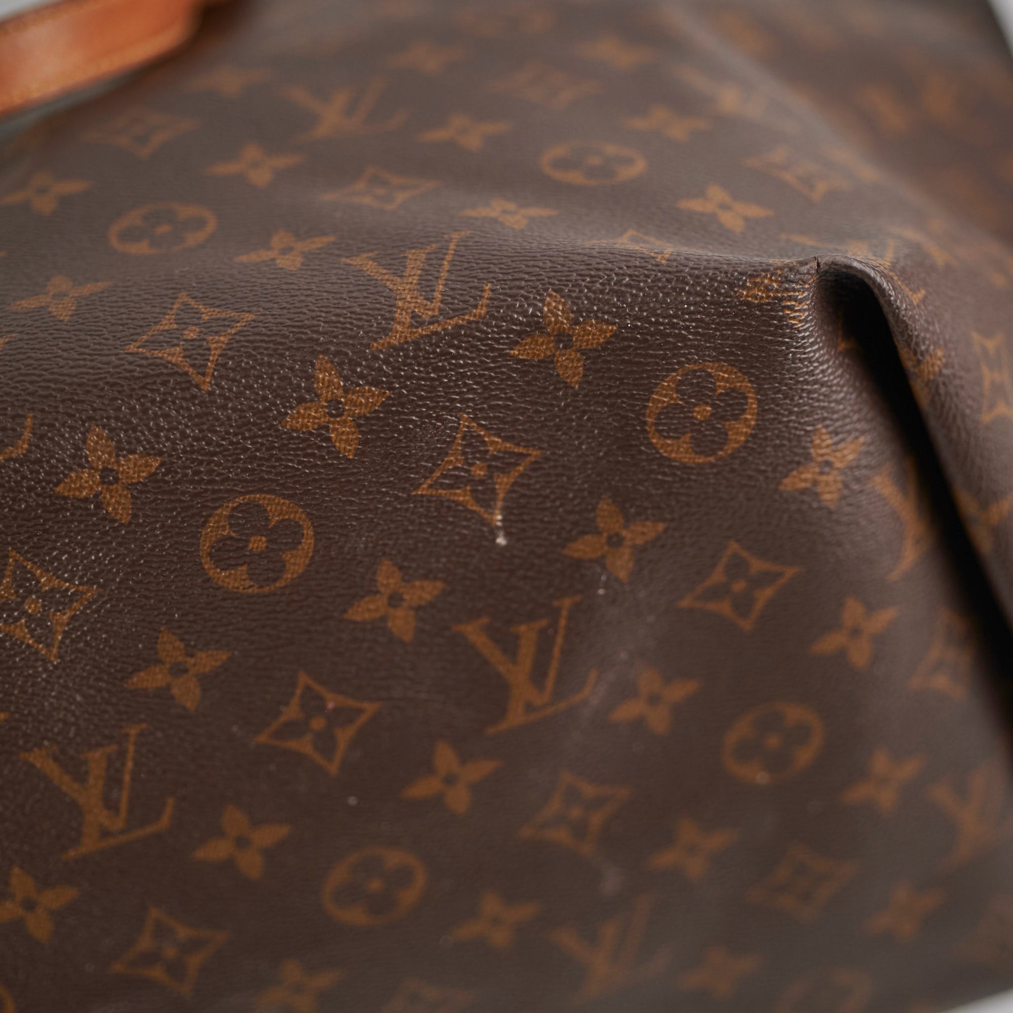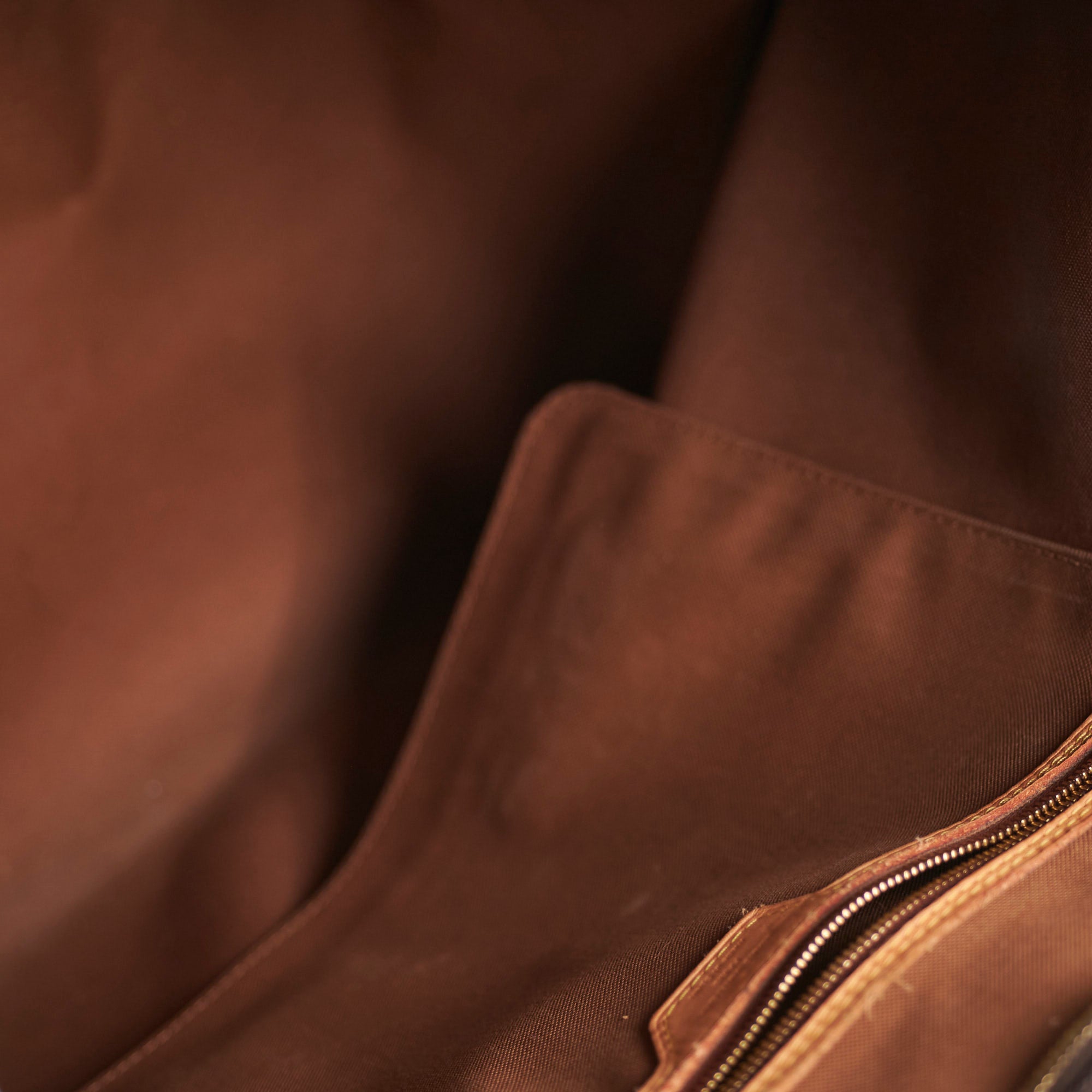 Darken on vachetta leather,hot stamp 'G.M' on swing tag, loosen thread on corner, rubbing on corners, stains interior, general signs of wear