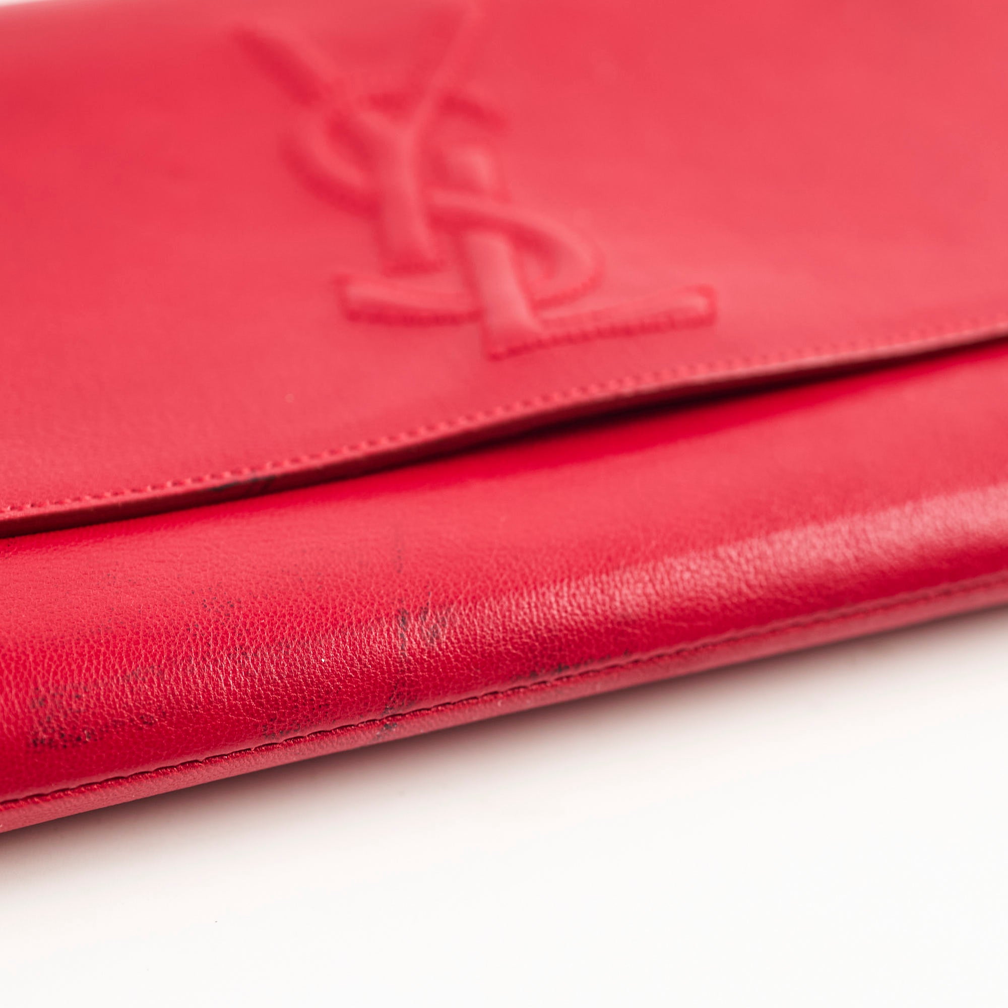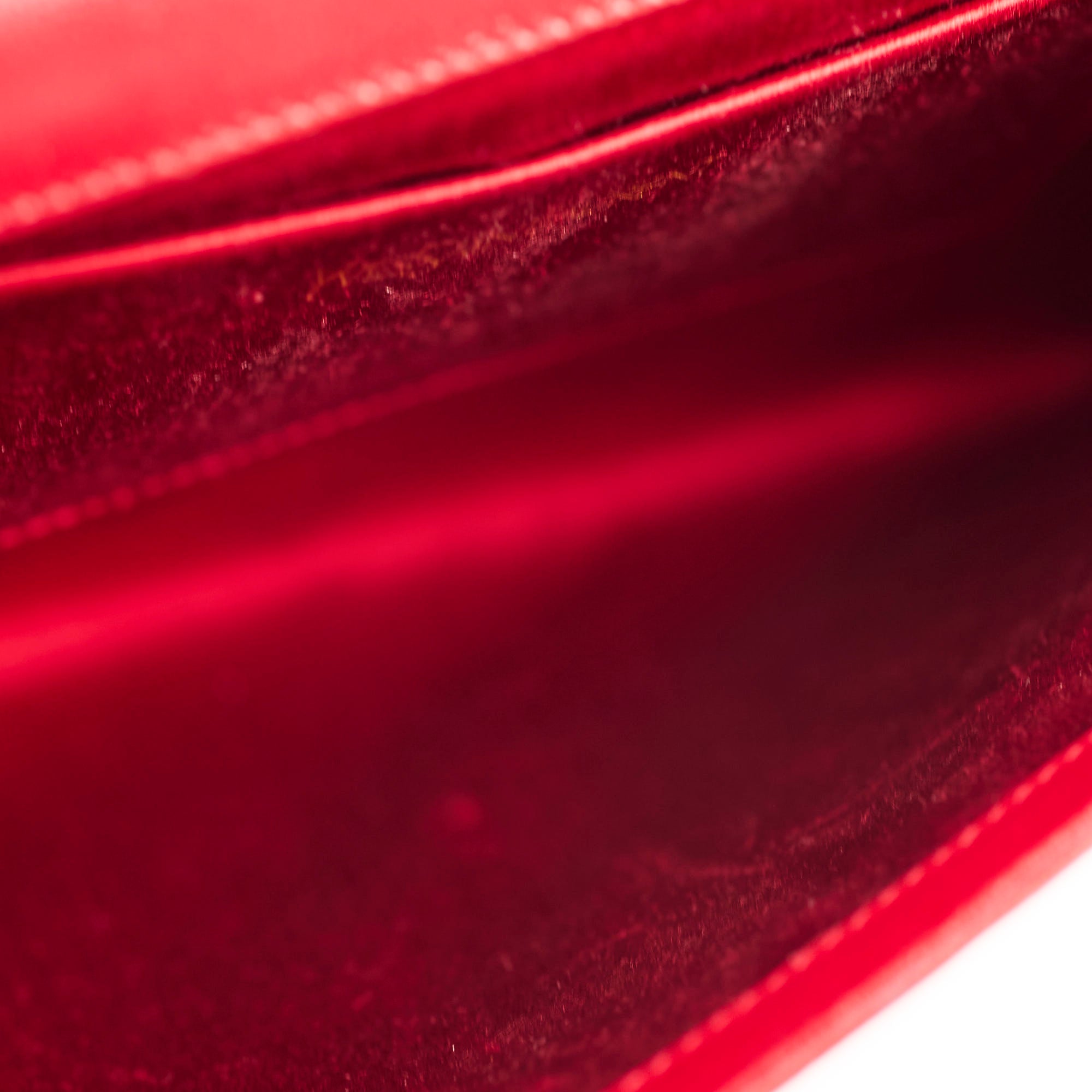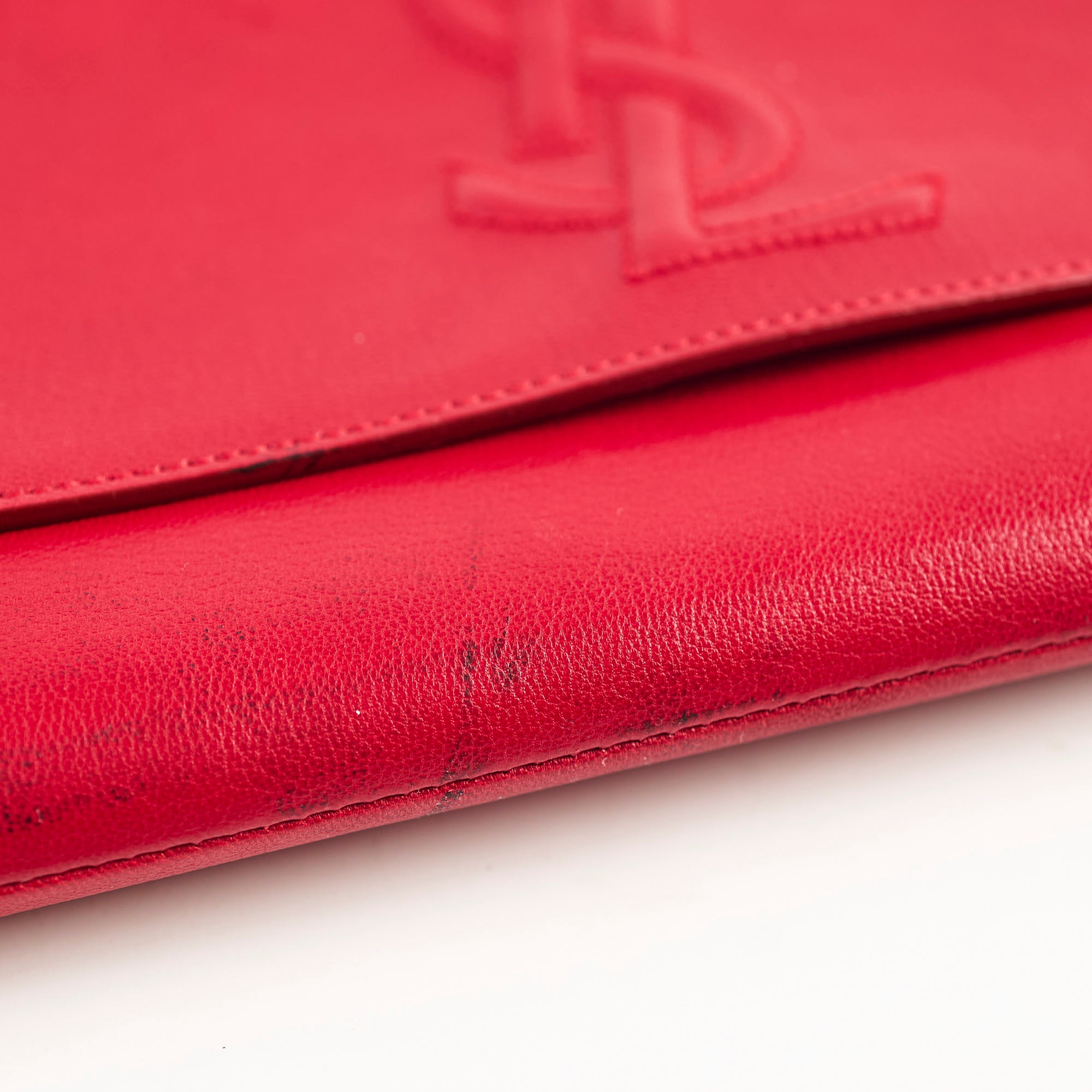 Light nail marks throughout leather, light black mark on front, light hairline scratches and rubbing on hardware