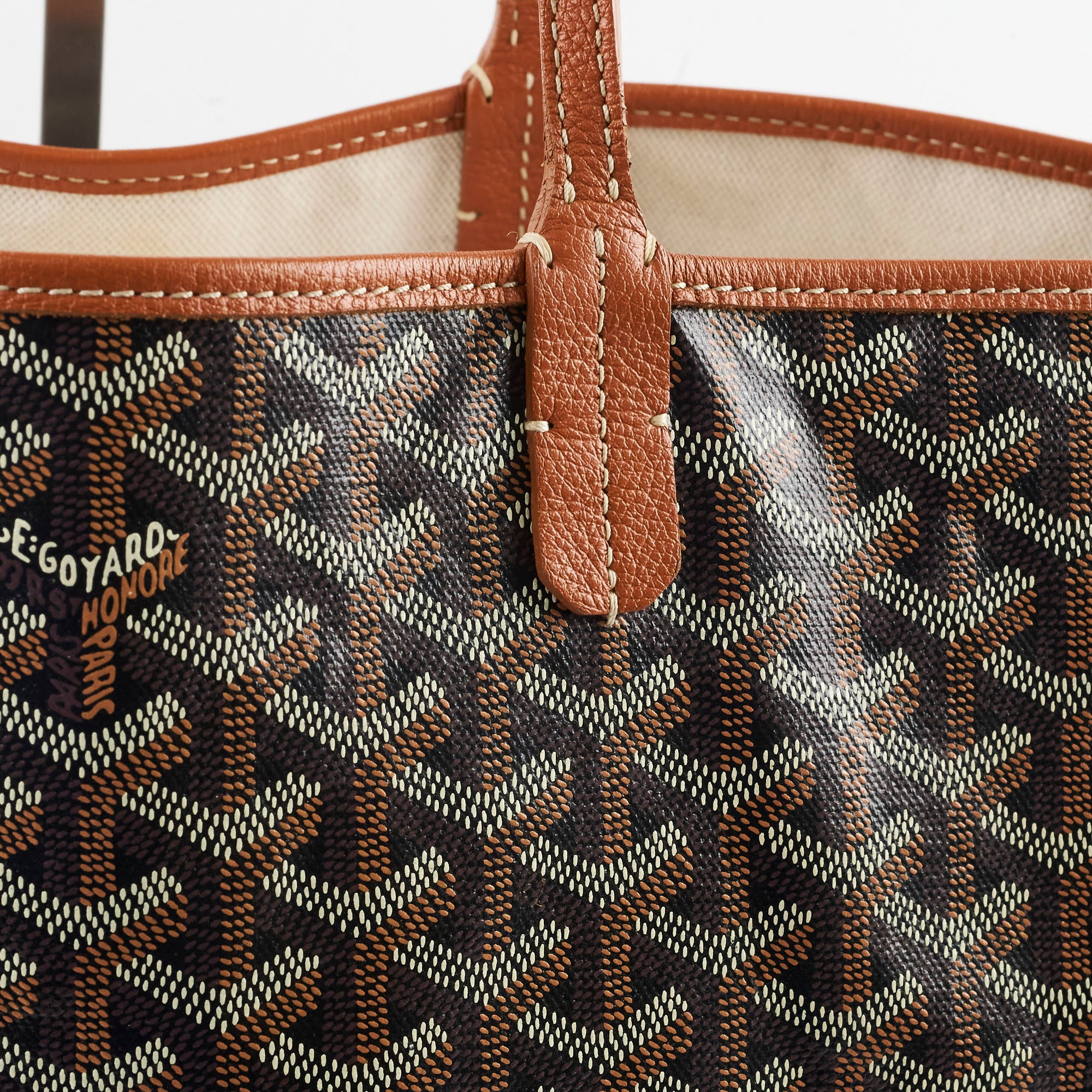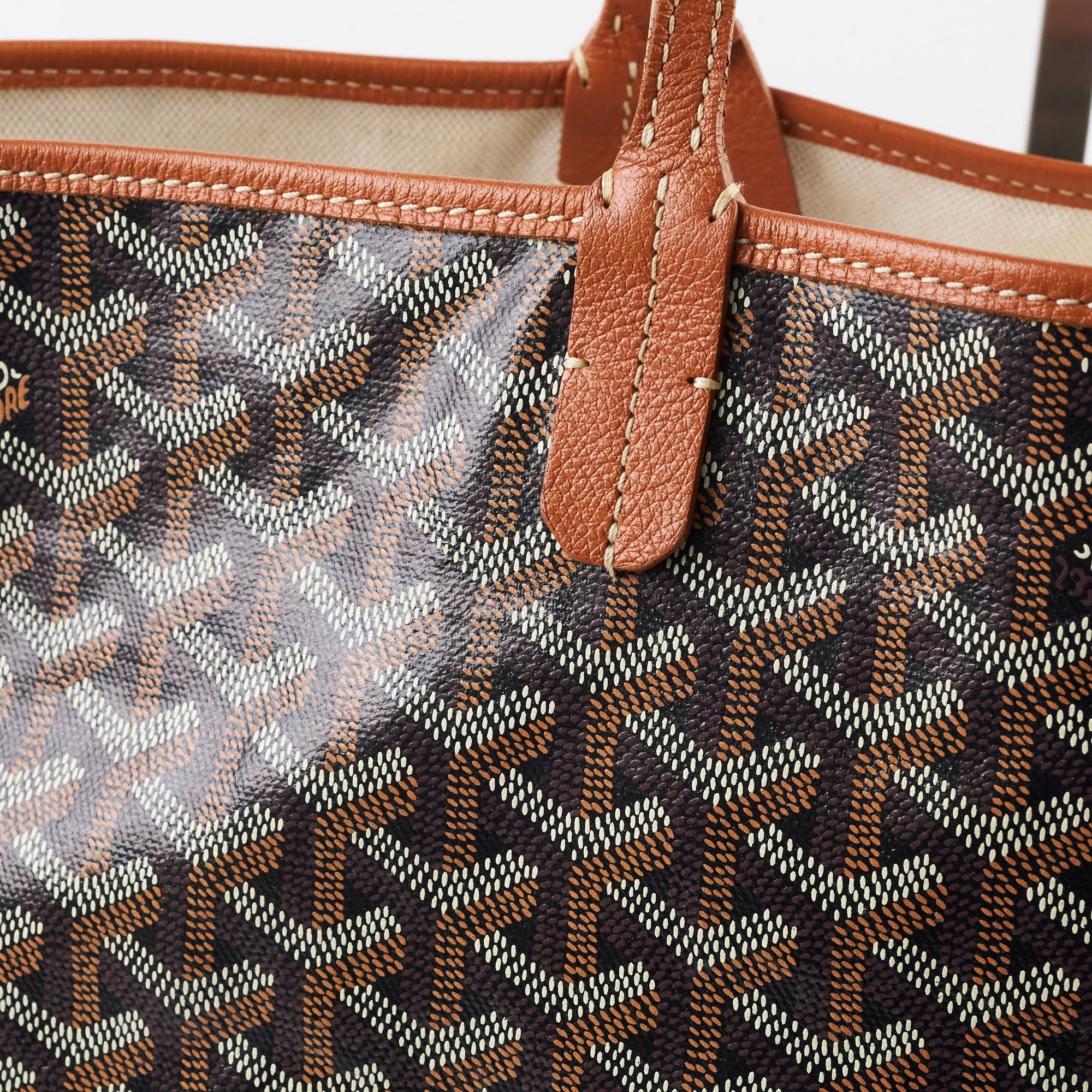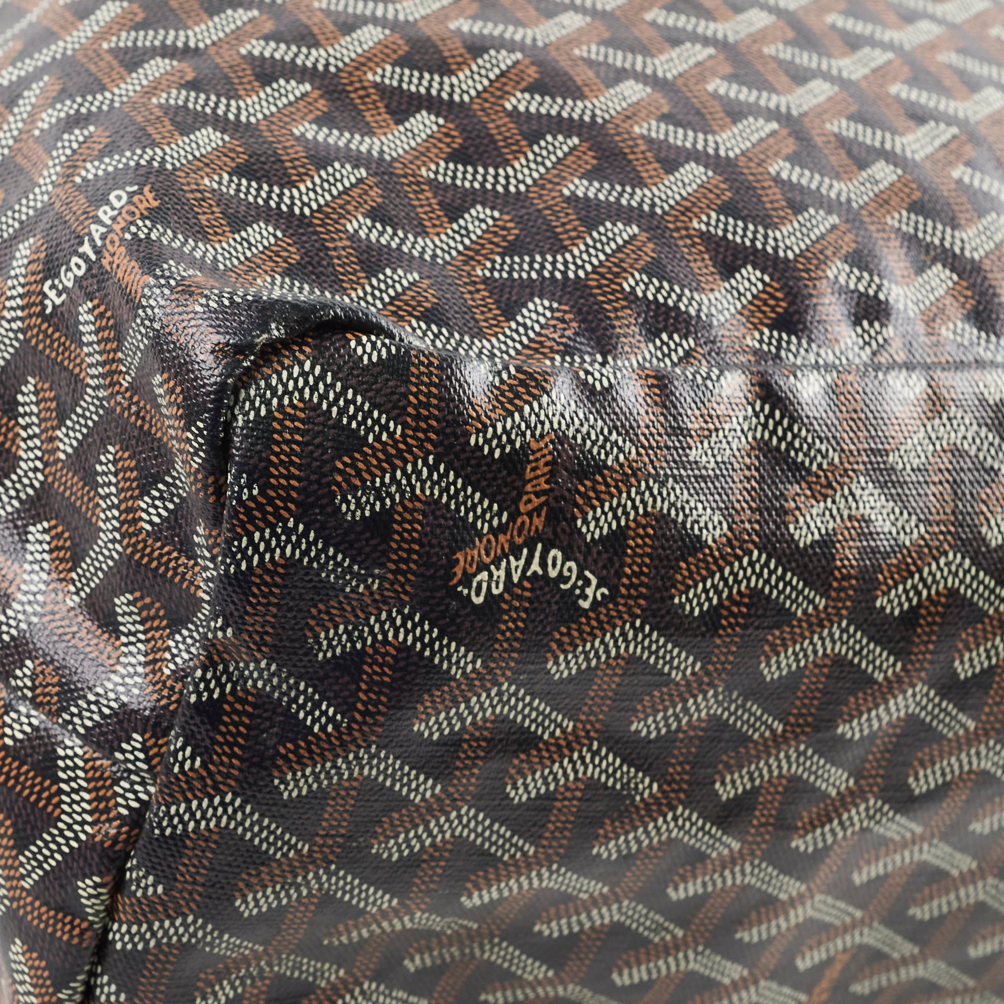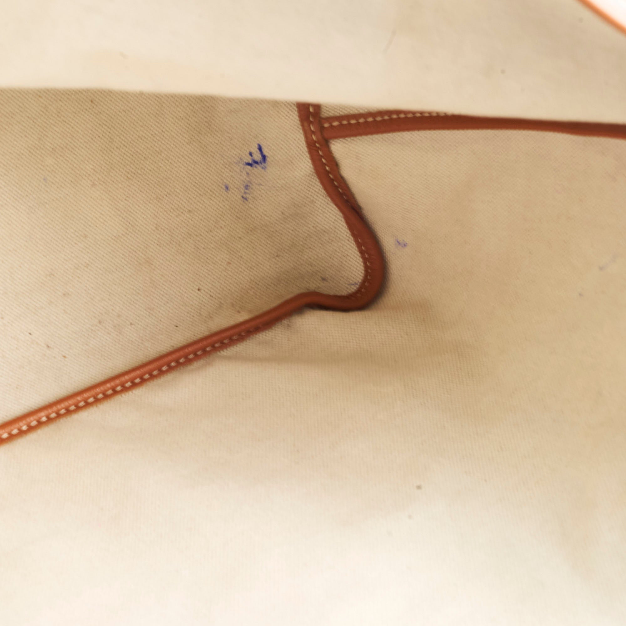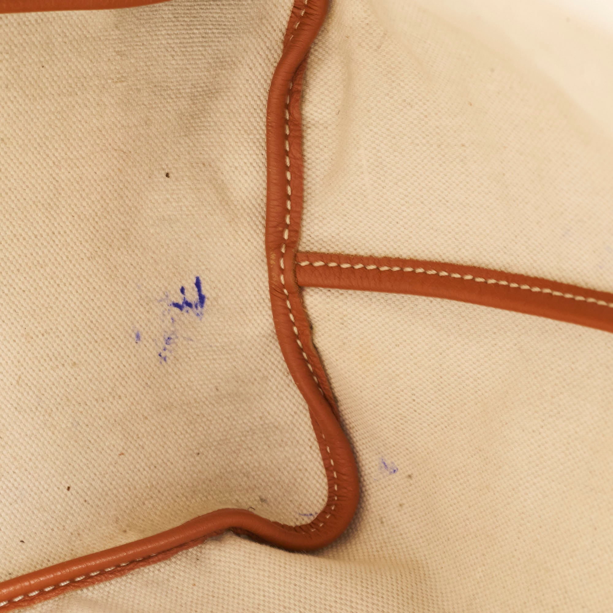 Rubbing on corners, stains and pen marks on interior canvas, light cracking on handles
