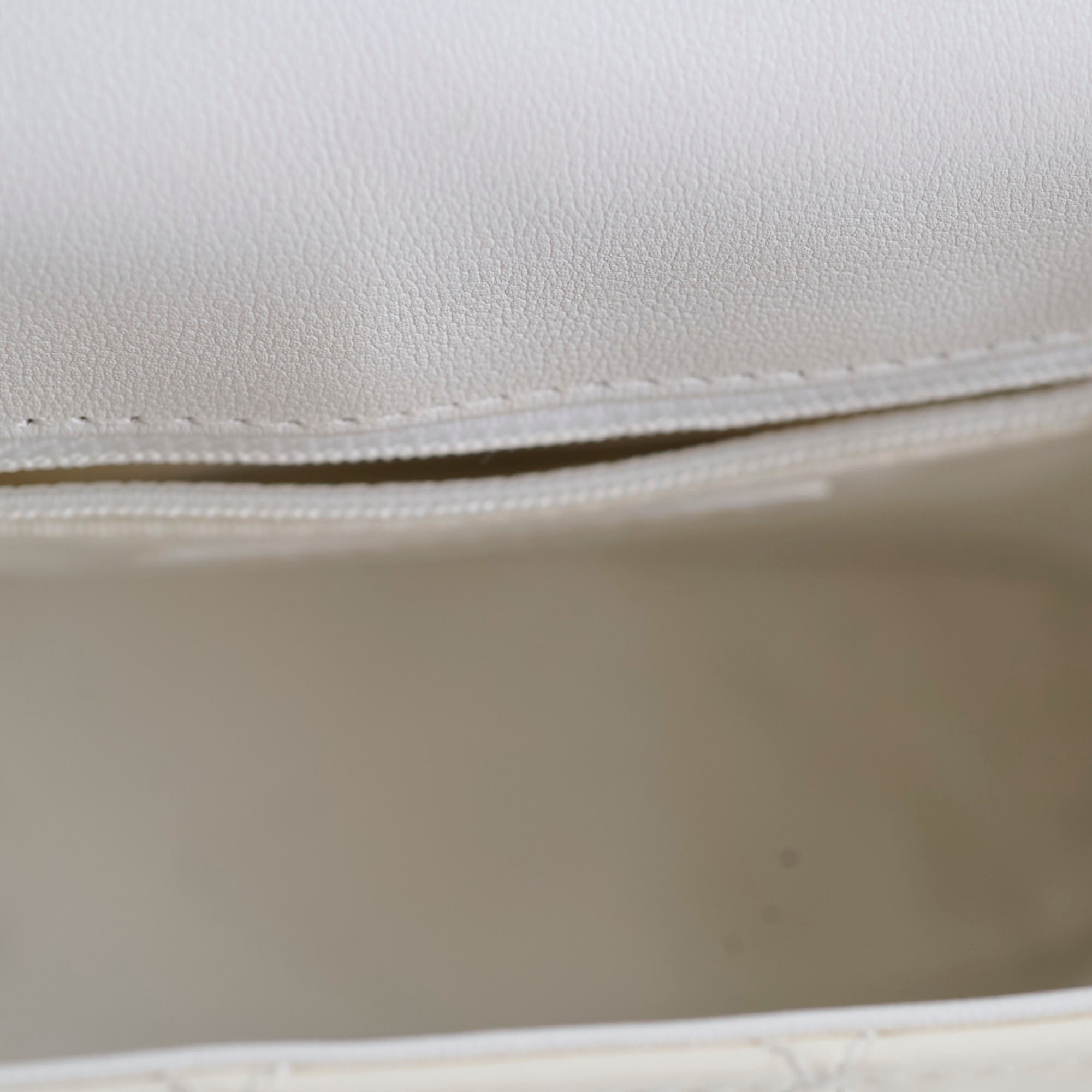 Pen marks at the bottom, stains on interior fabric, light scratches on hardware, one indent at the front leather