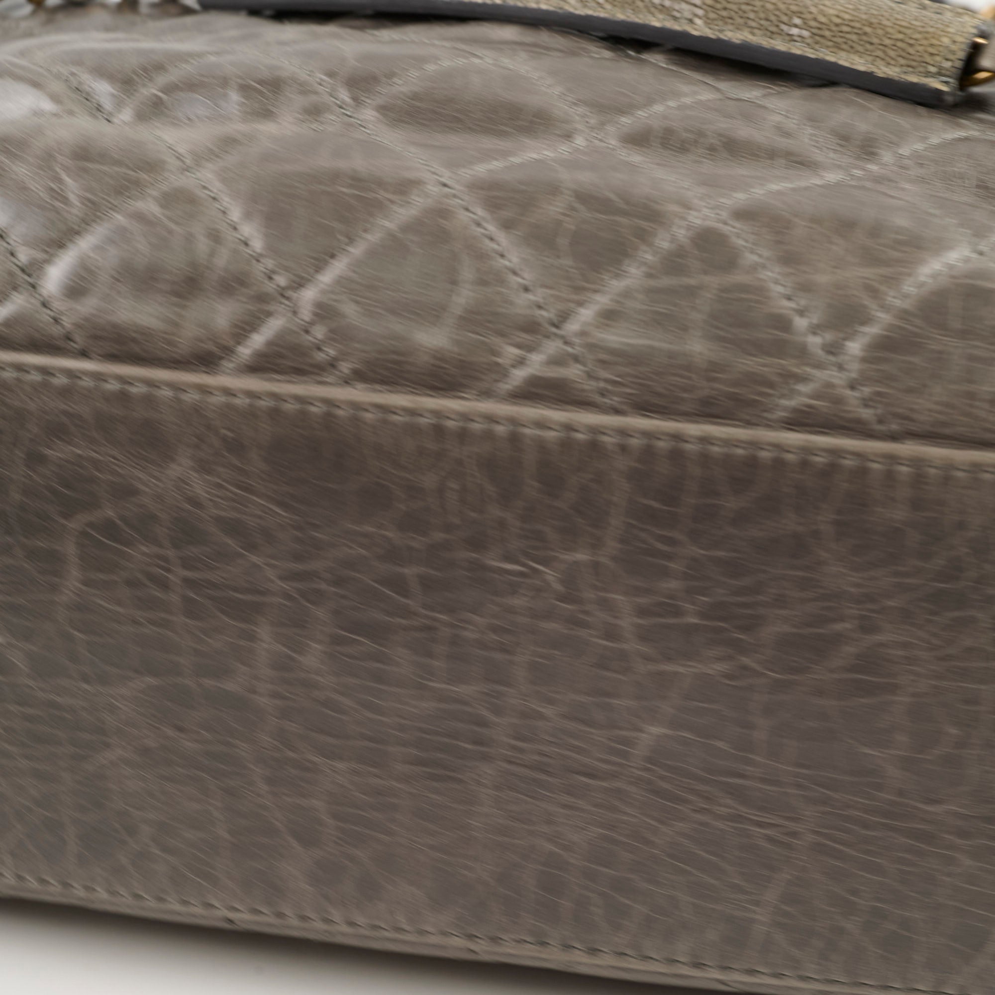 Minor scuffs, small mark interior, soften structure and creasing on leather, light scuffs on handles, light tarnishing on hardware