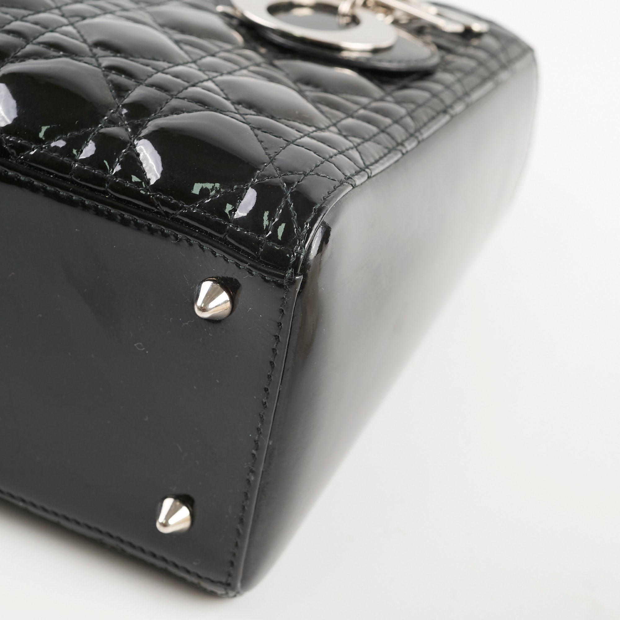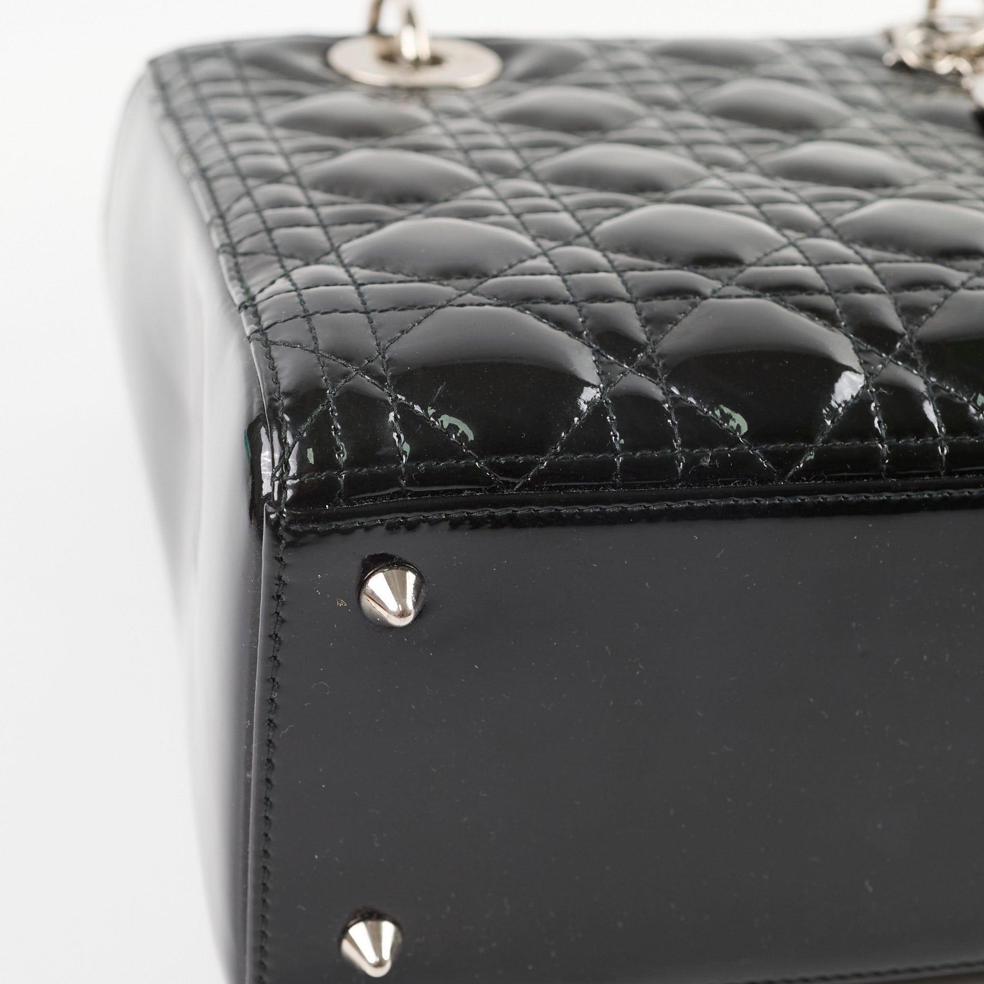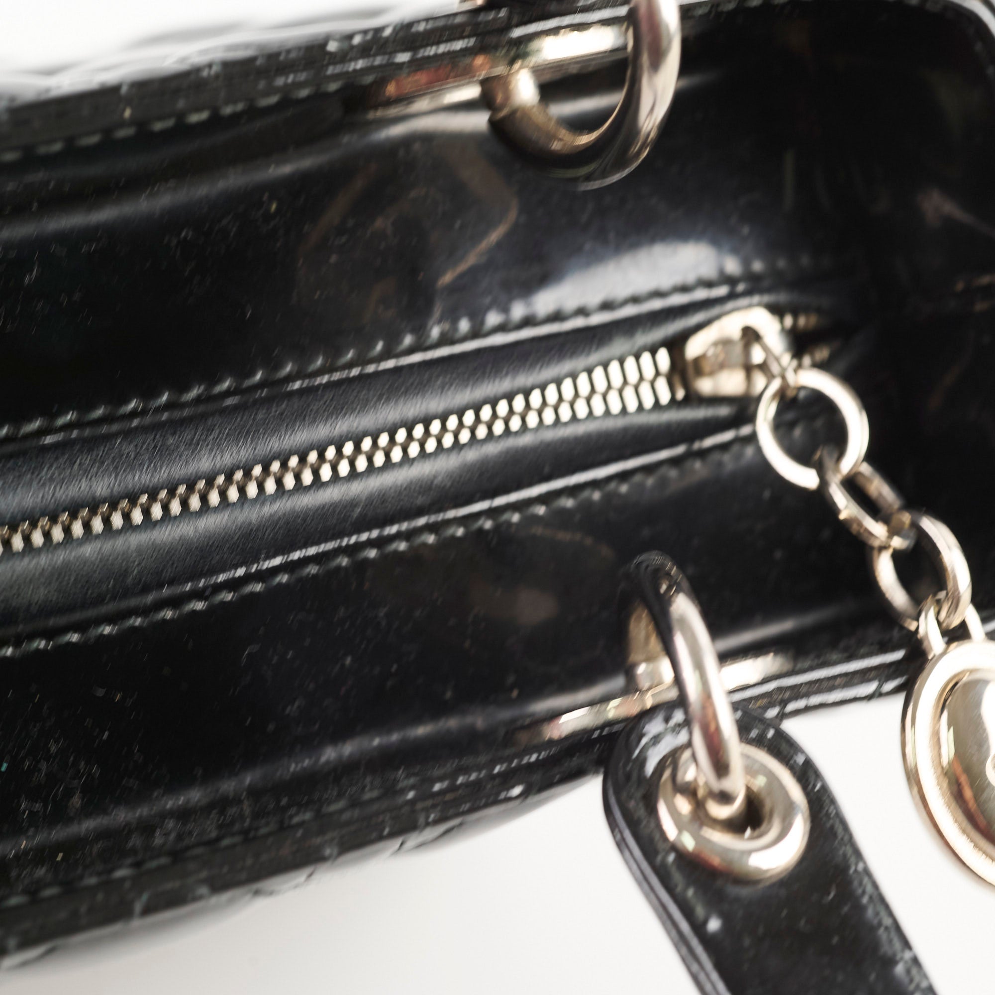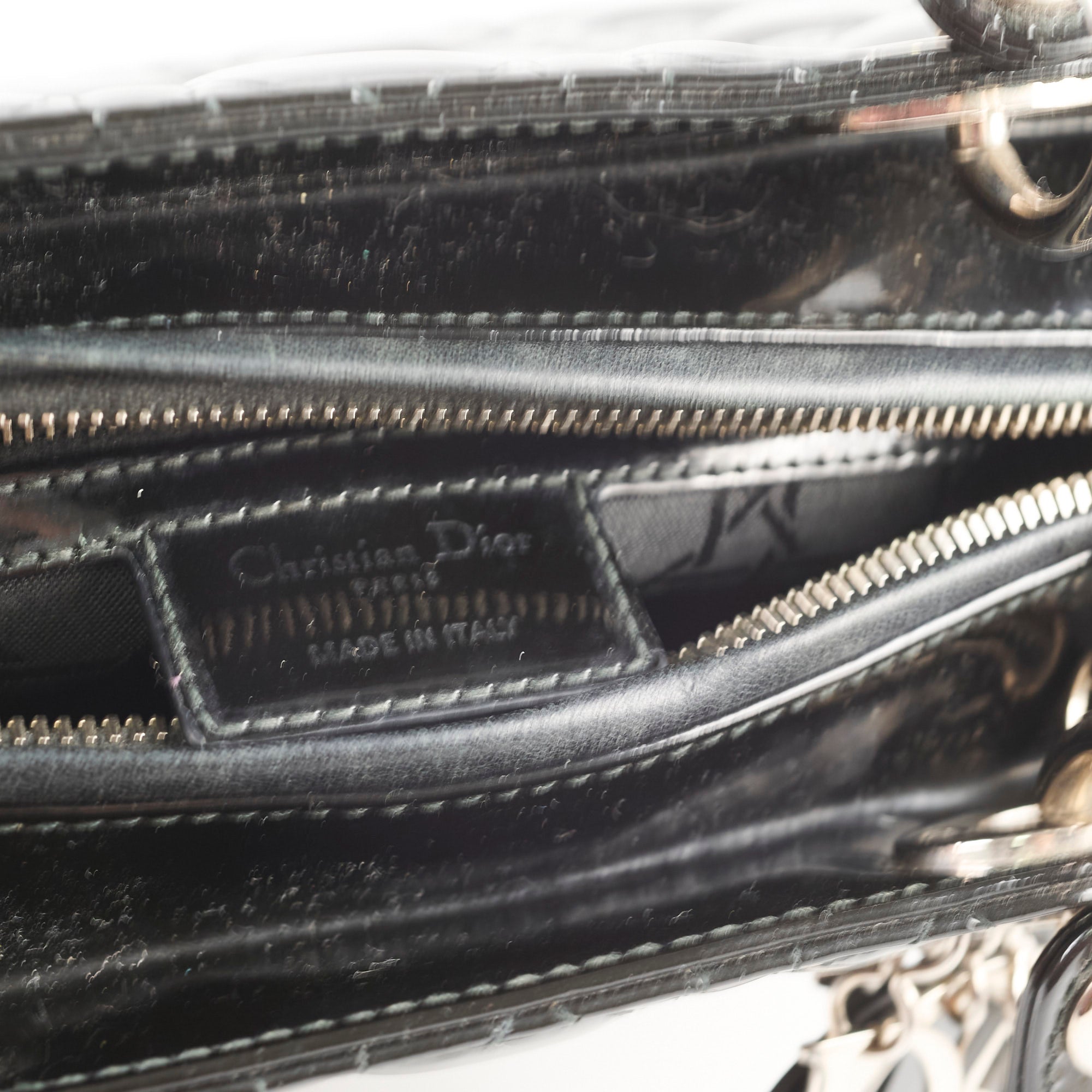 Dull on patent, scratches and indents on leather, scratches on hardware, creasing and stains on strap, rubbing on leather near zipper