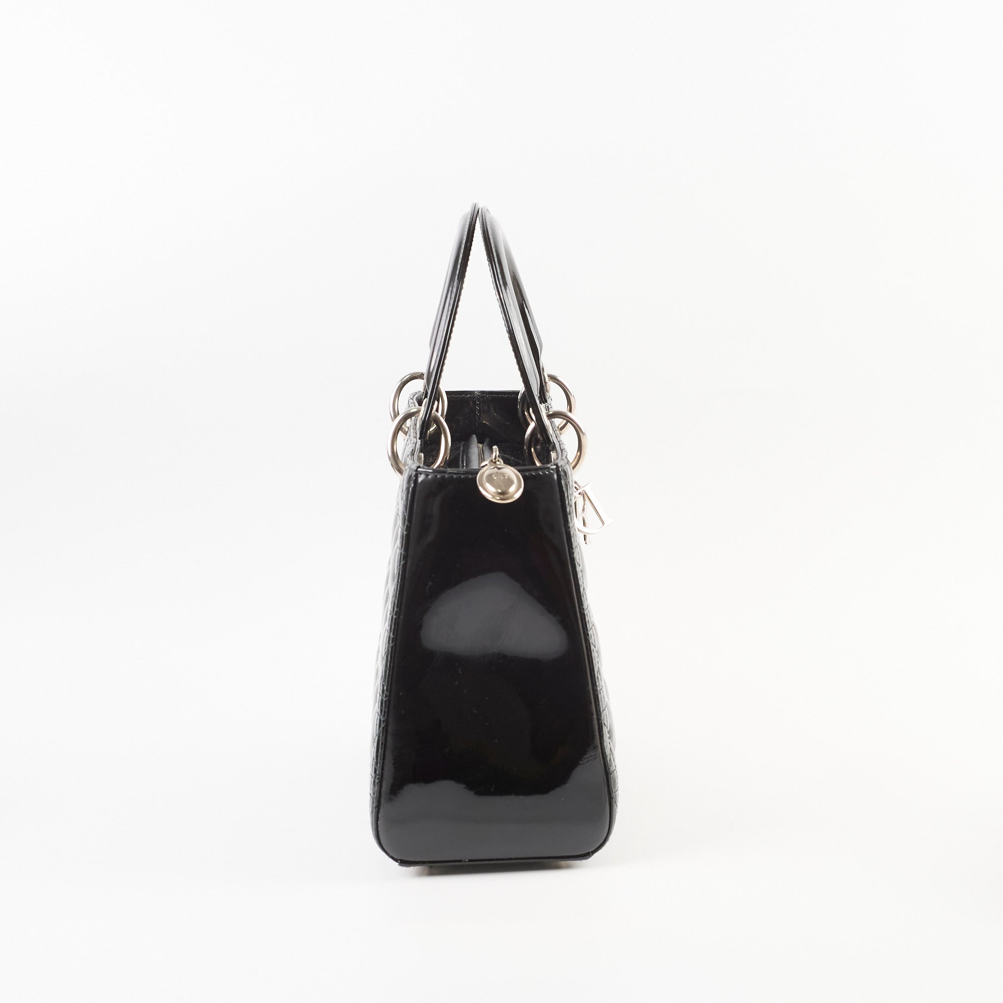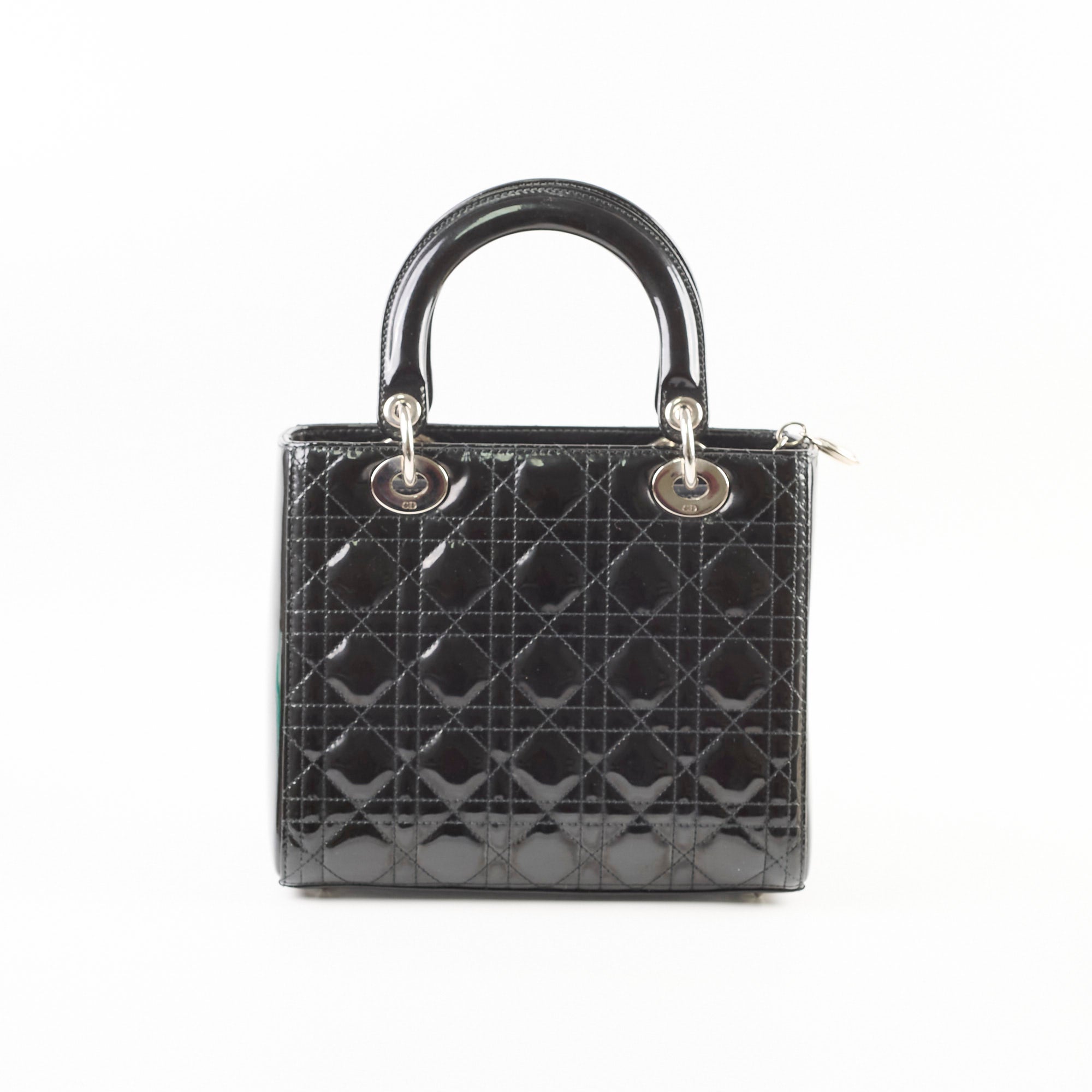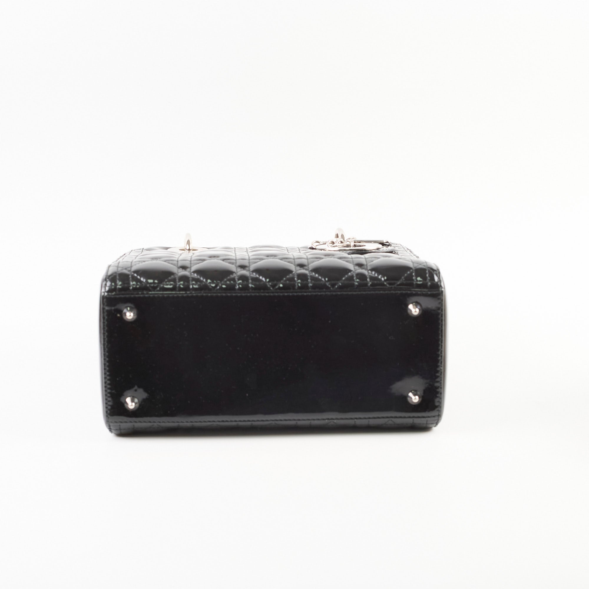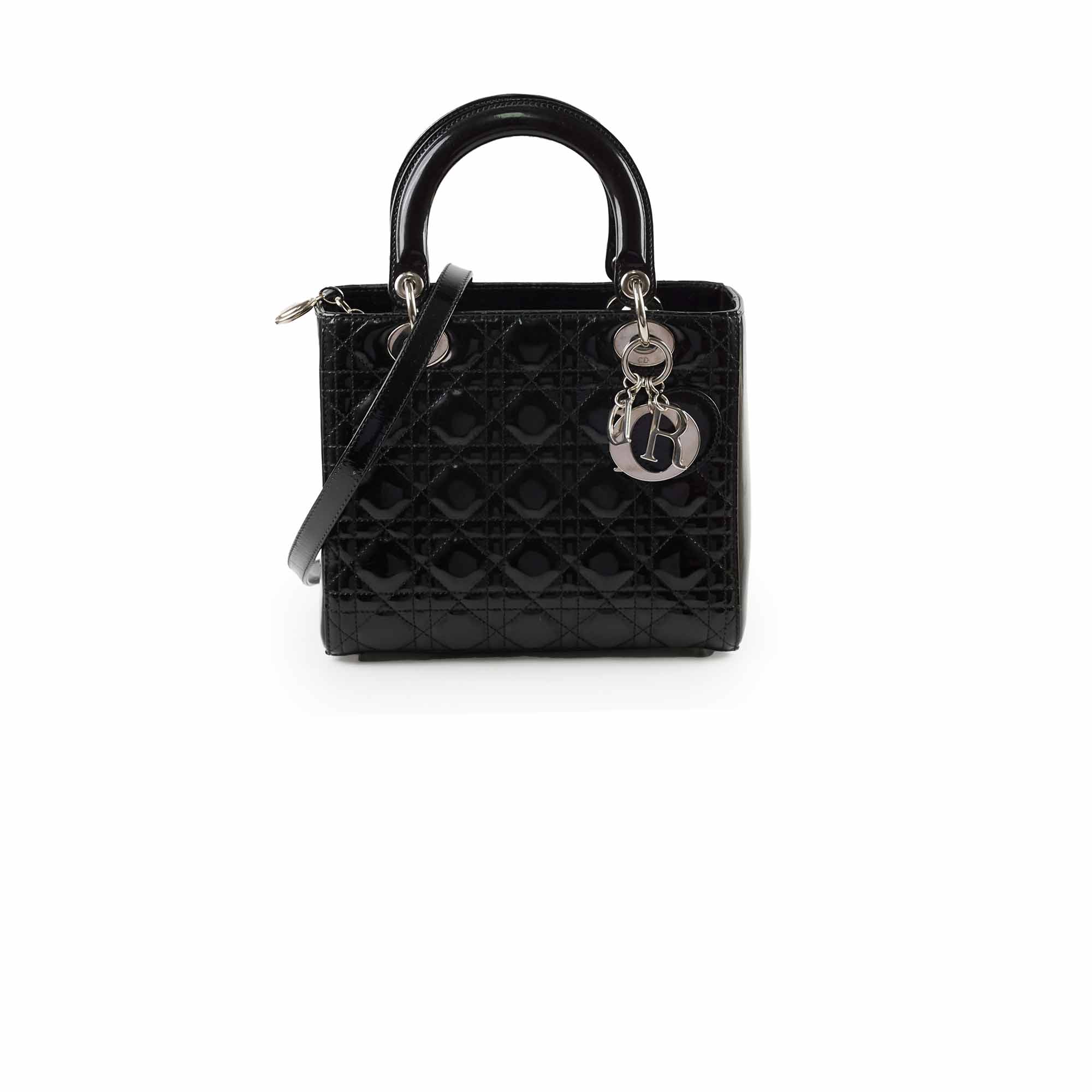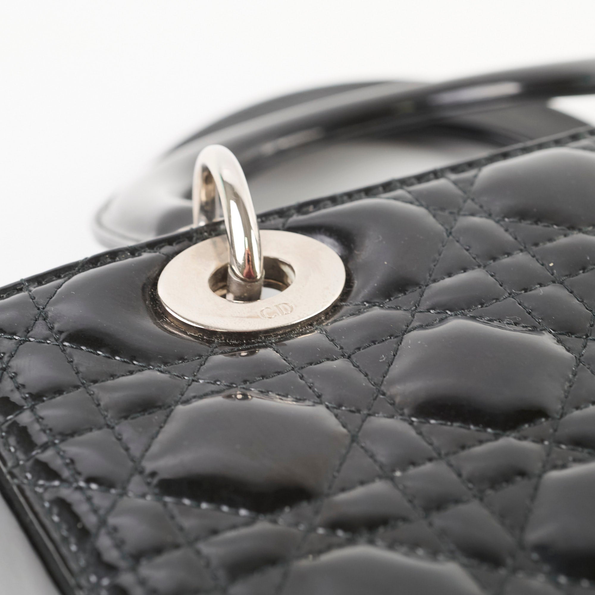 Dull on patent, scratches and indents on leather, scratches on hardware, creasing and stains on strap, rubbing on leather near zipper