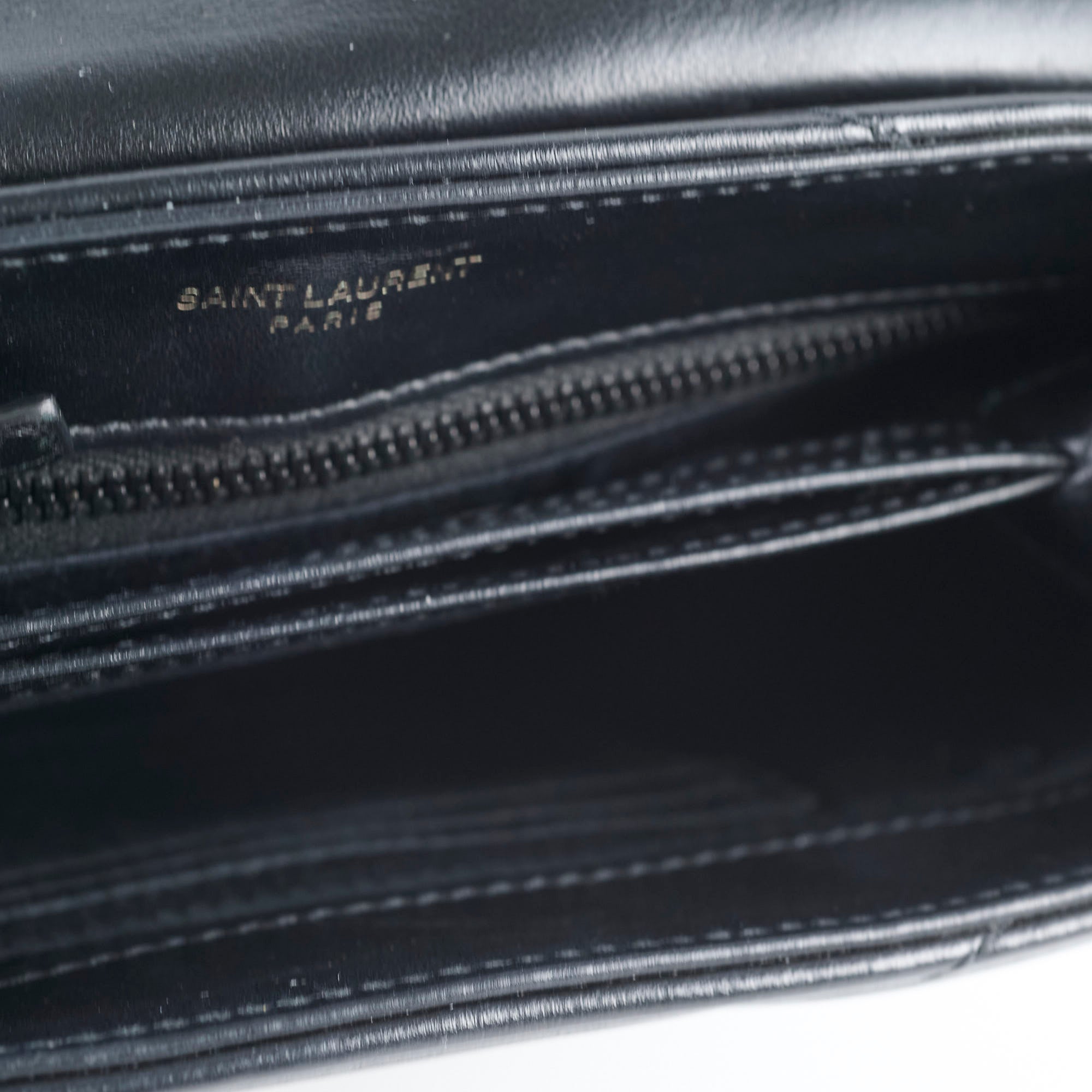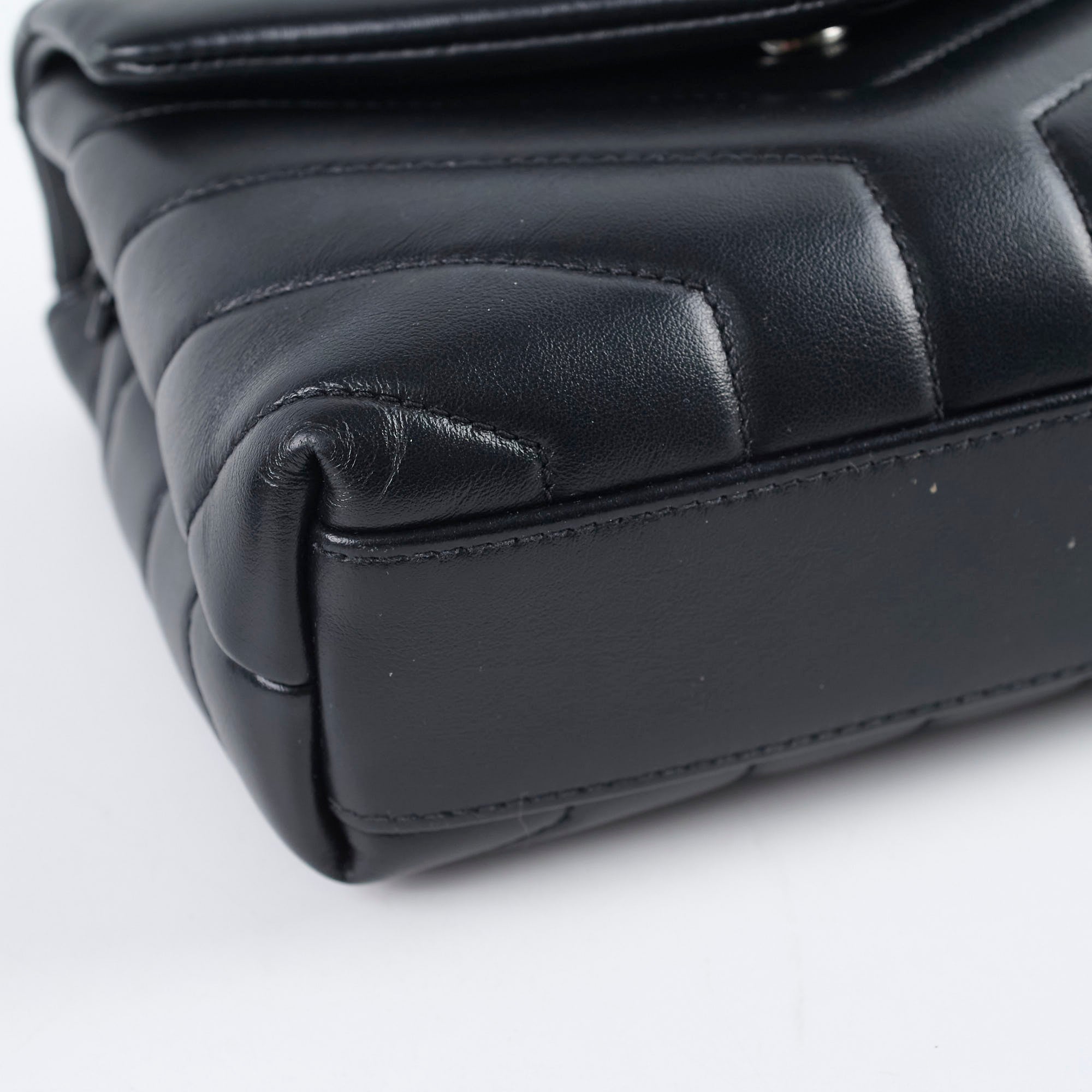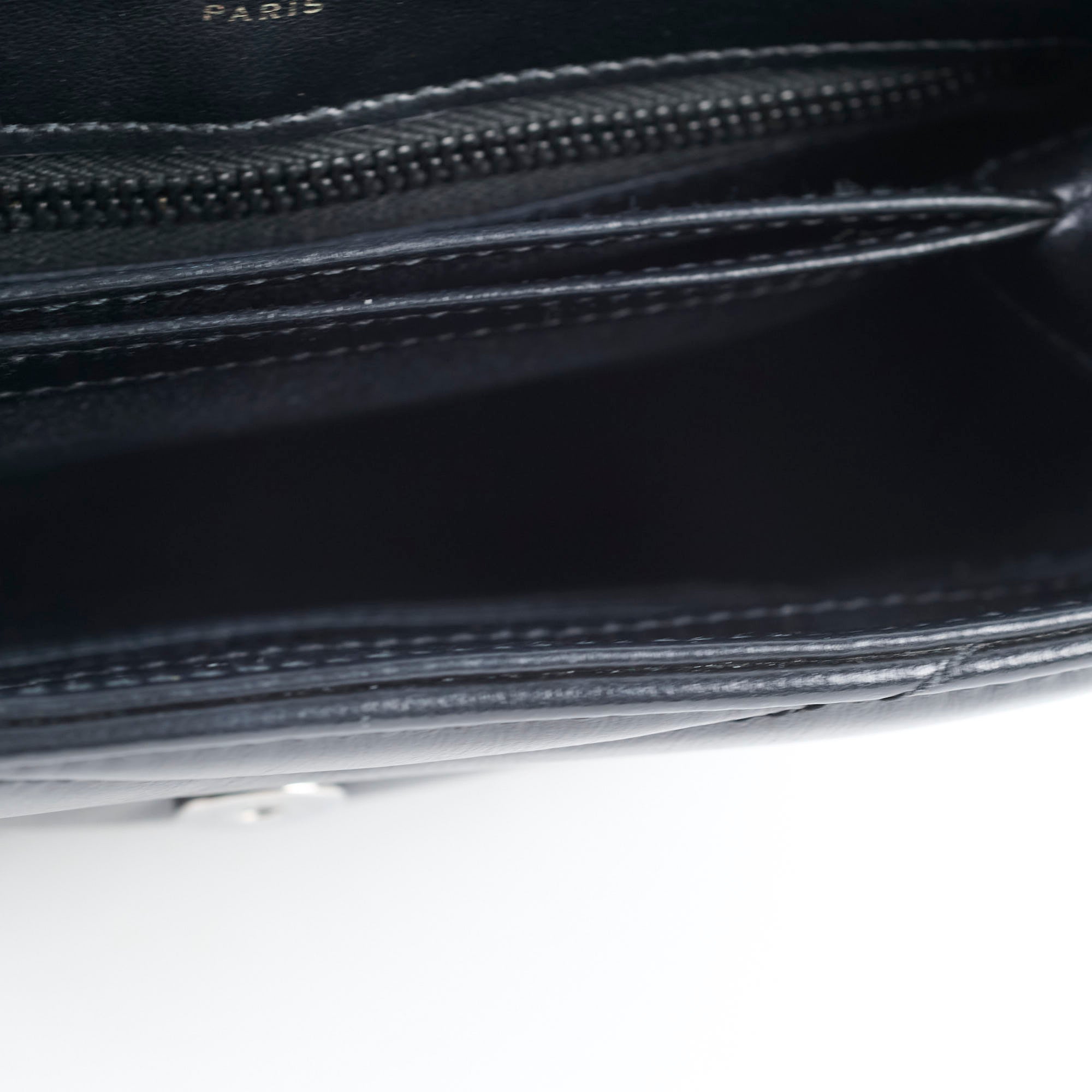 Tiny rubbing on one corner, faint hairline scratches on hardware, leather in excellent condition, clean inside out