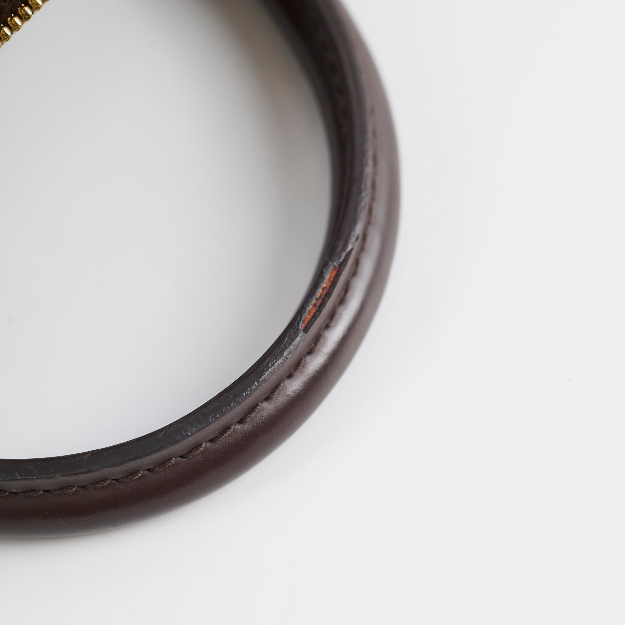 One glazing nick on the handle, clean overall with very faint nail marks on the leather
