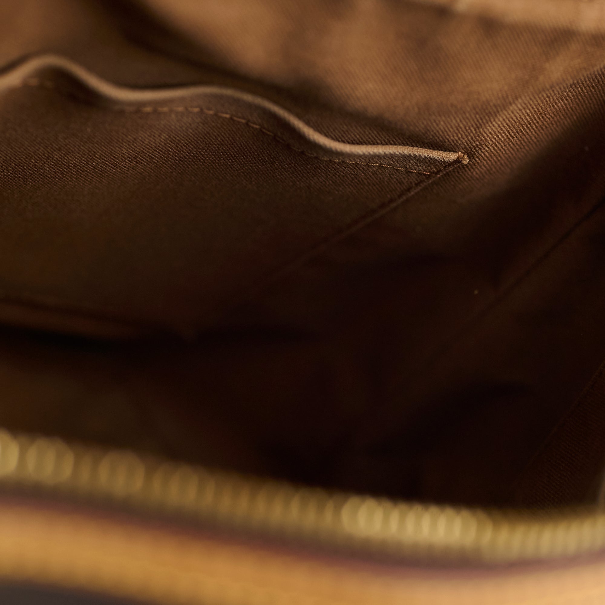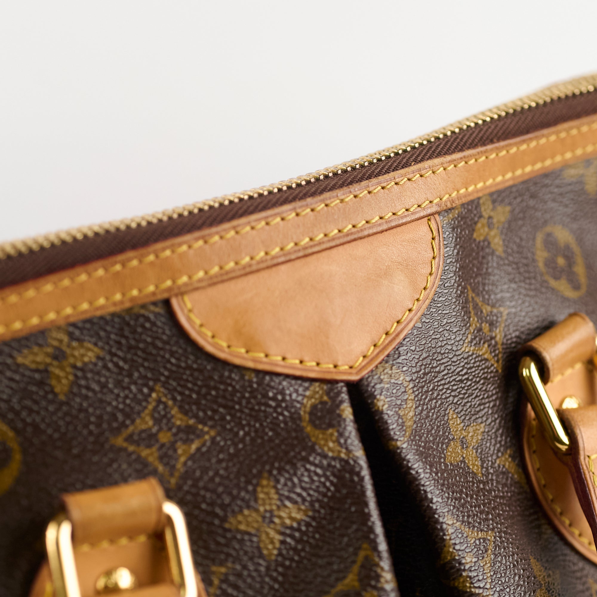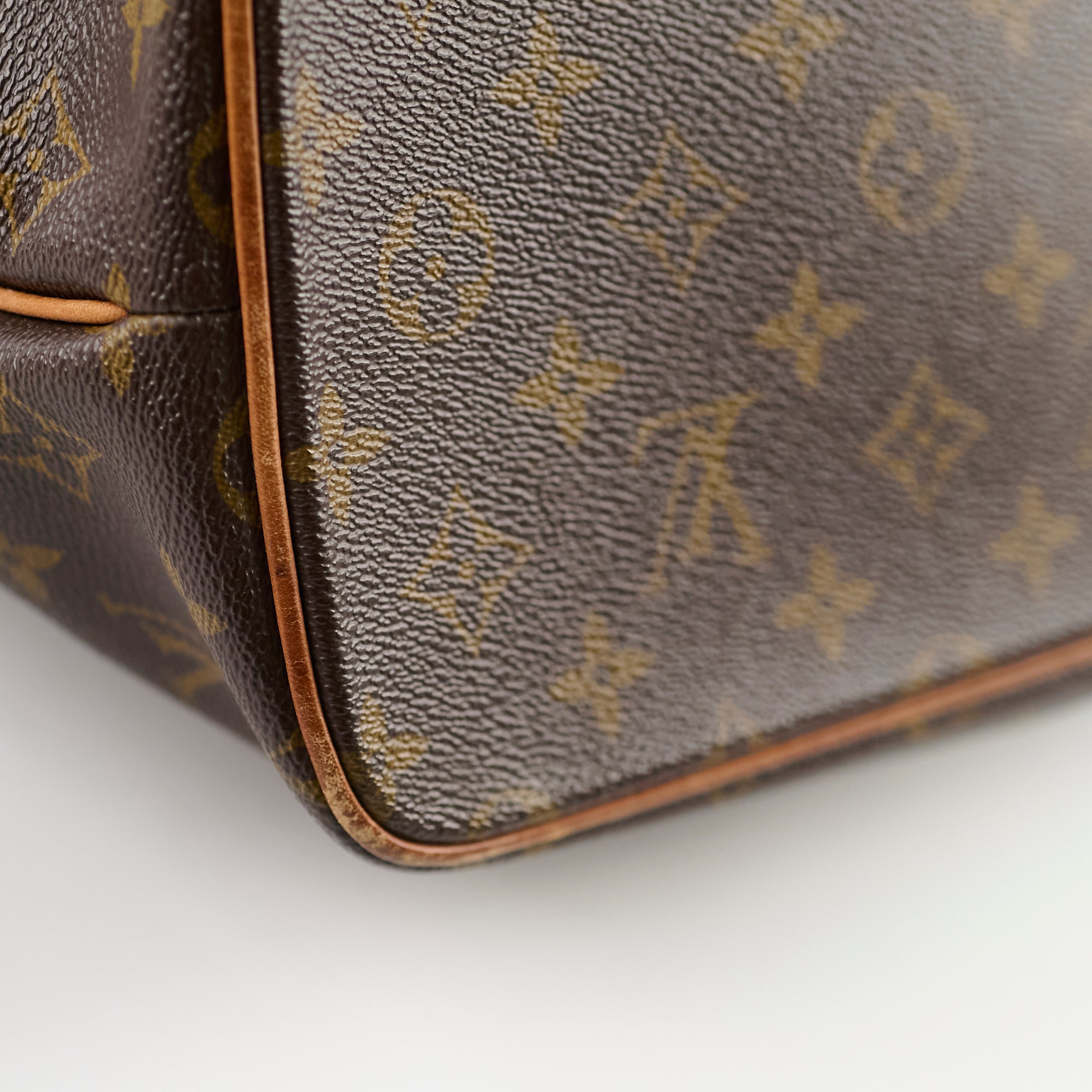 Rubbing on corners/base & handles, darkening & marks on vachetta, tarnishing on hardware, stains interior