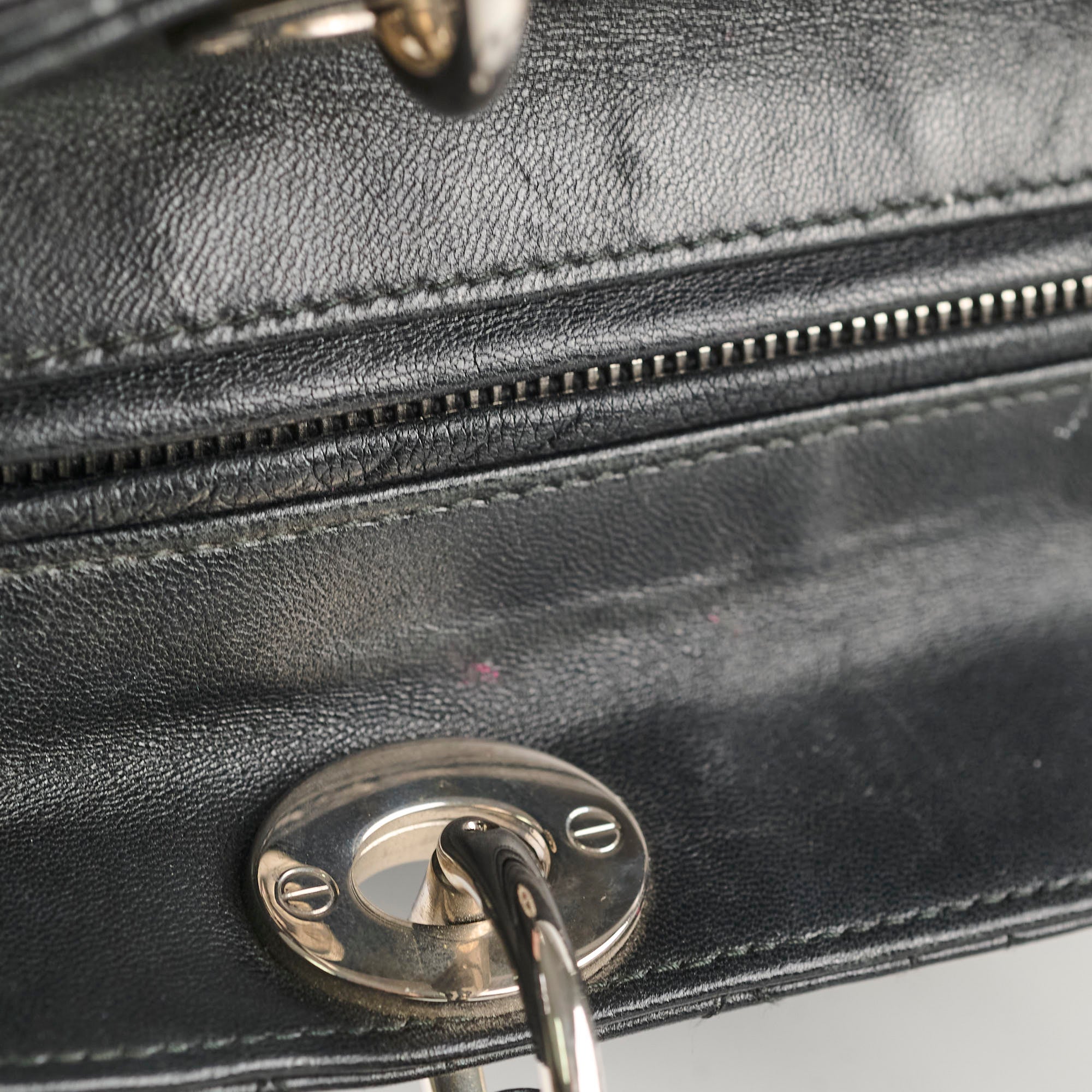 Nail marks throughout, hairline scratches and tarnishing on hardware, rubbing on corners, clean inside