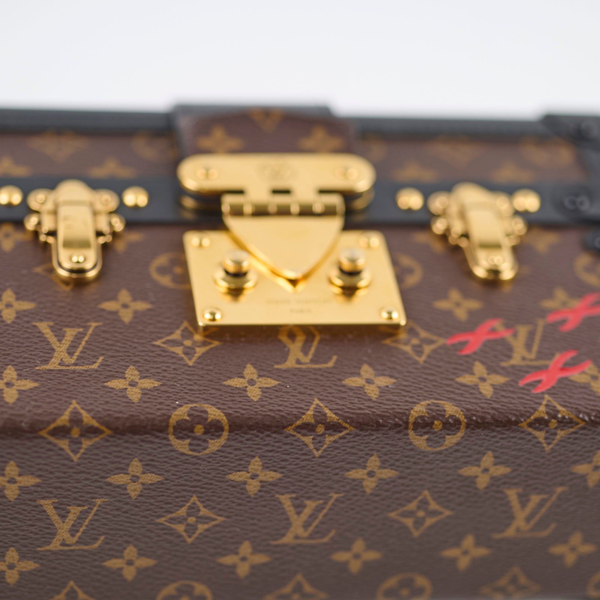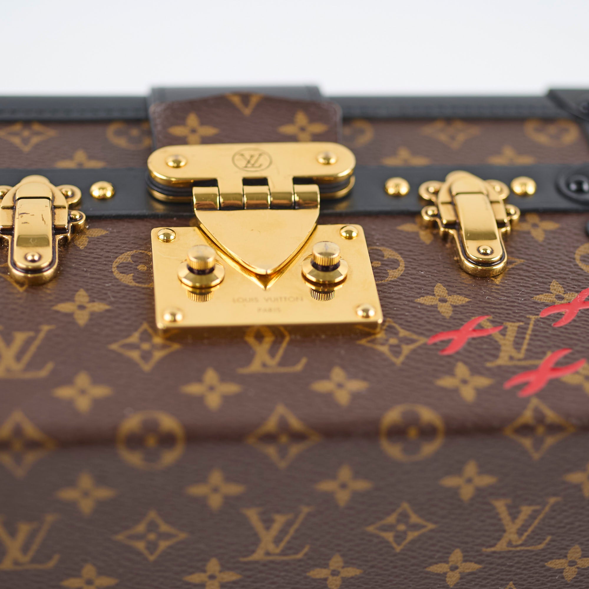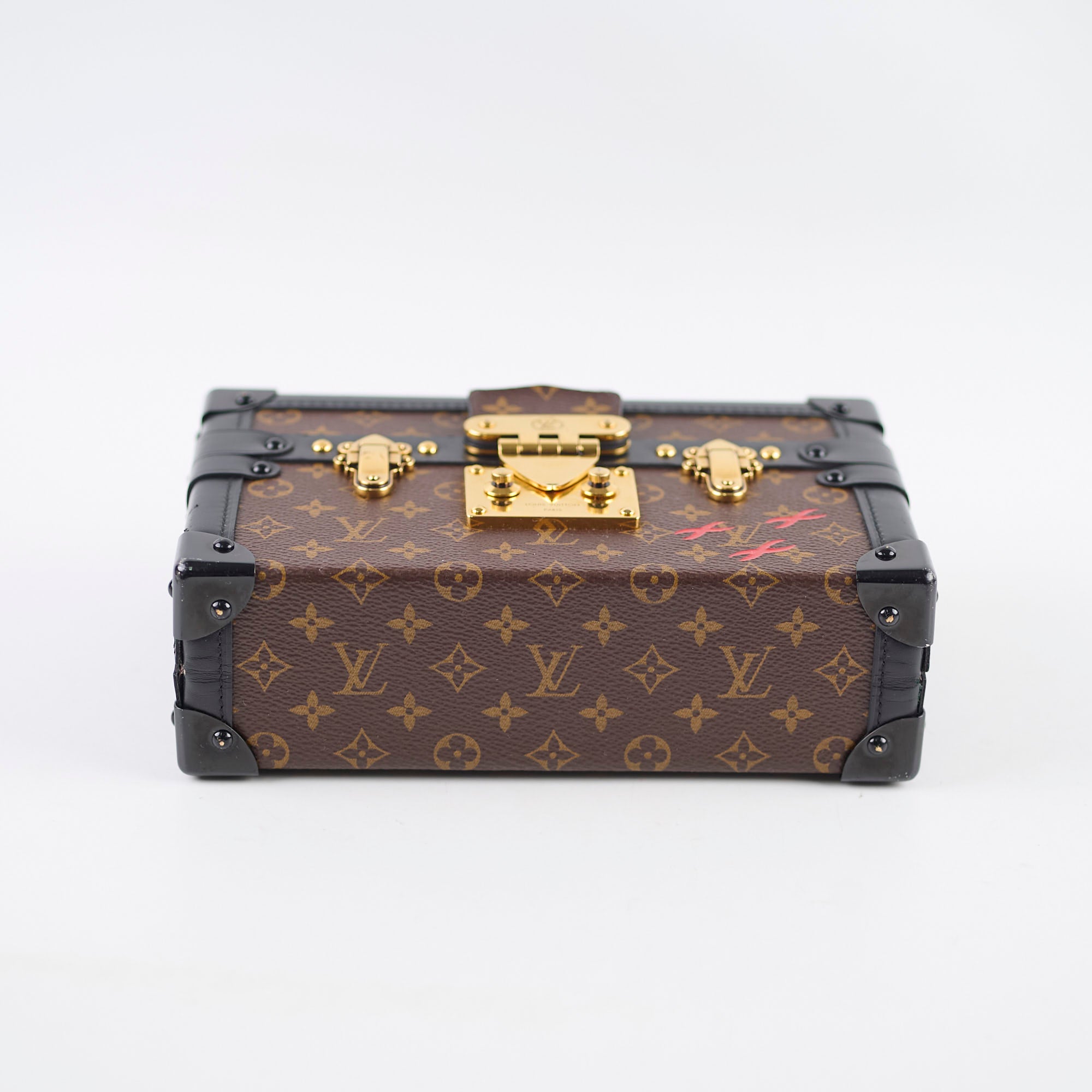 Minor scratches on corners, indents interior, hairline scratches on hardware, general still in excellent condition