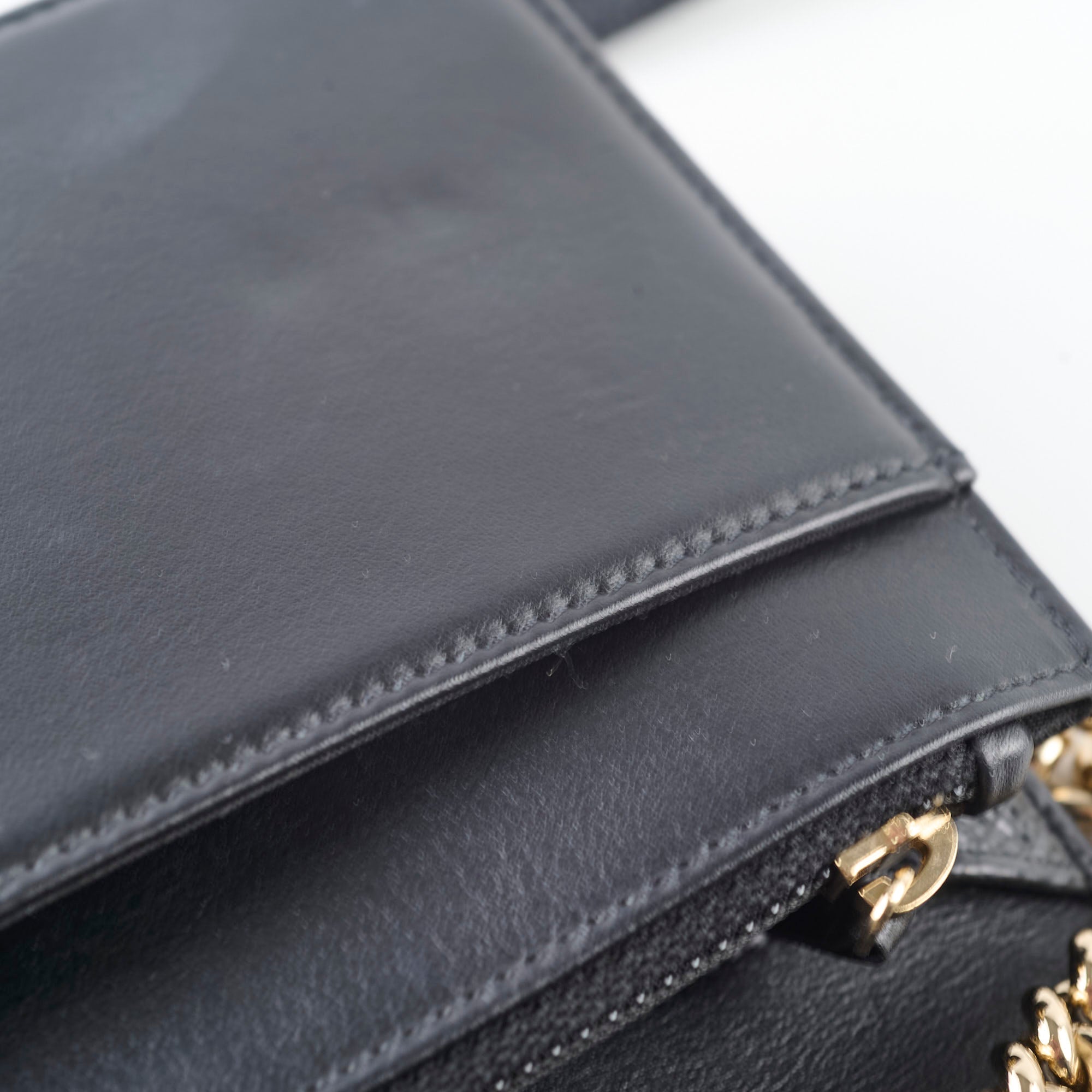 Minor indent under the flap from zipper (unavoidable), slight soften base, corners free from rubbing, clean interior