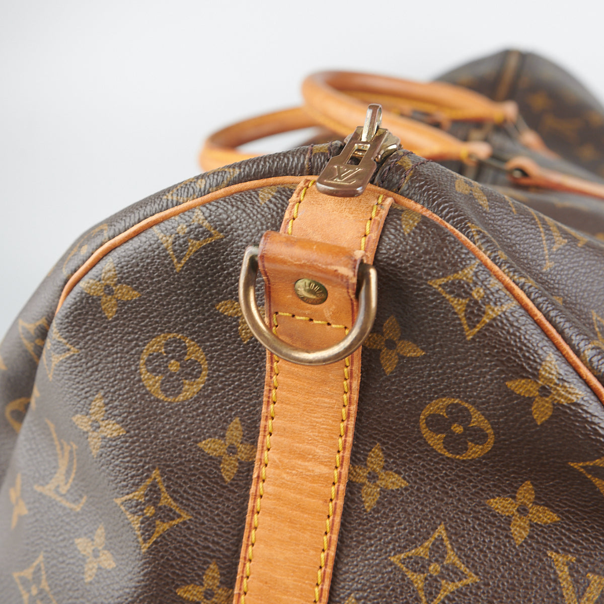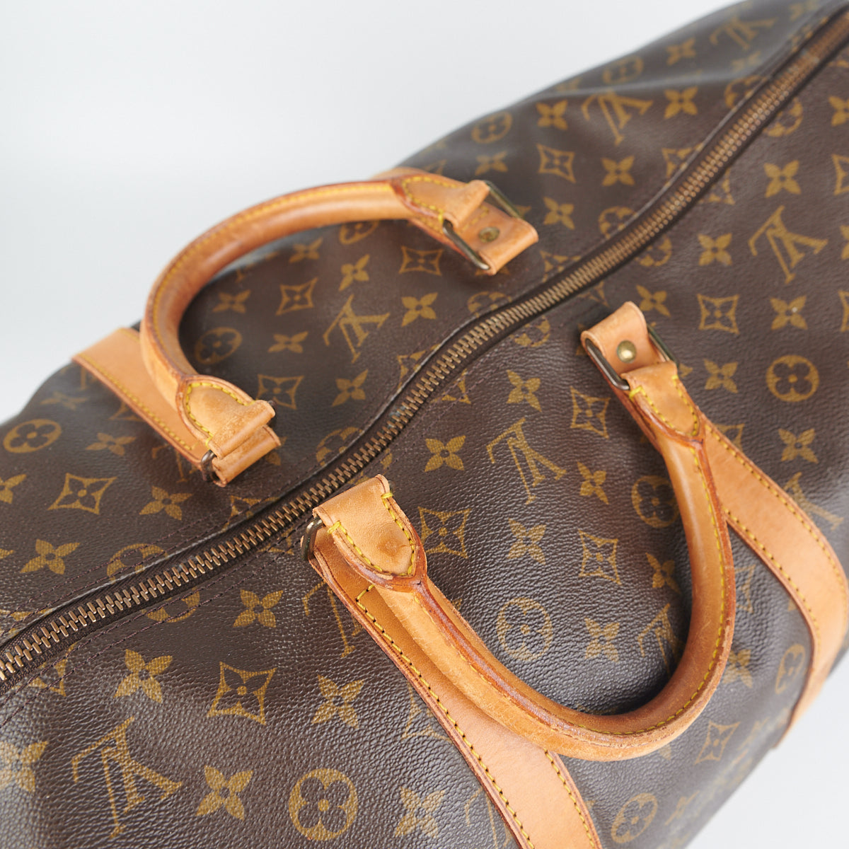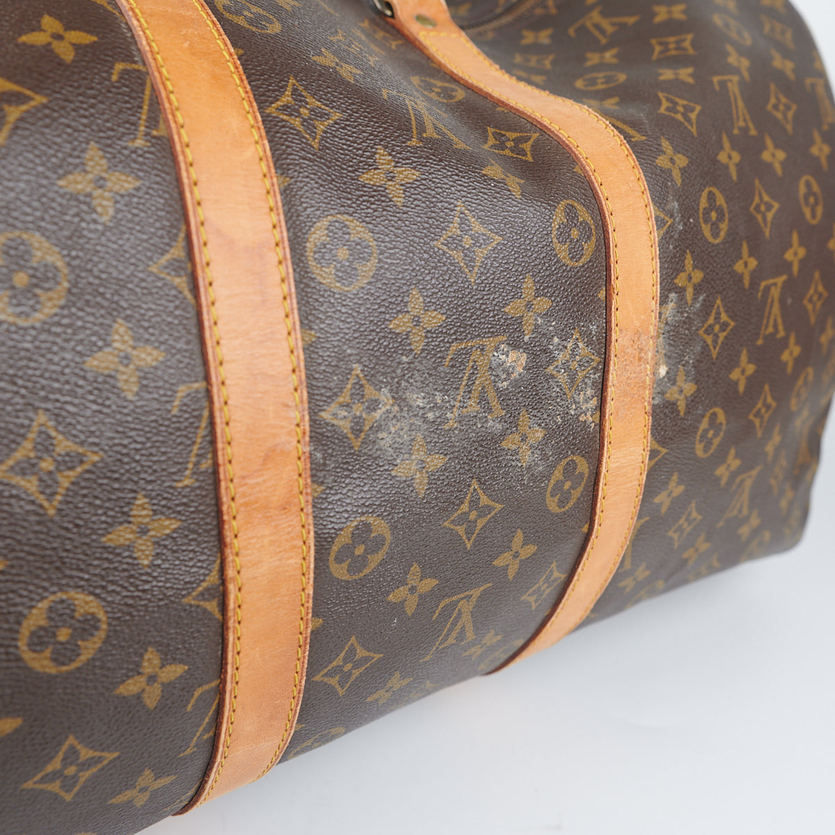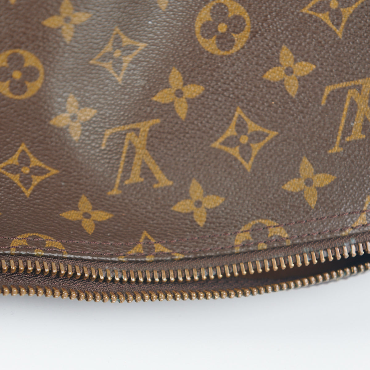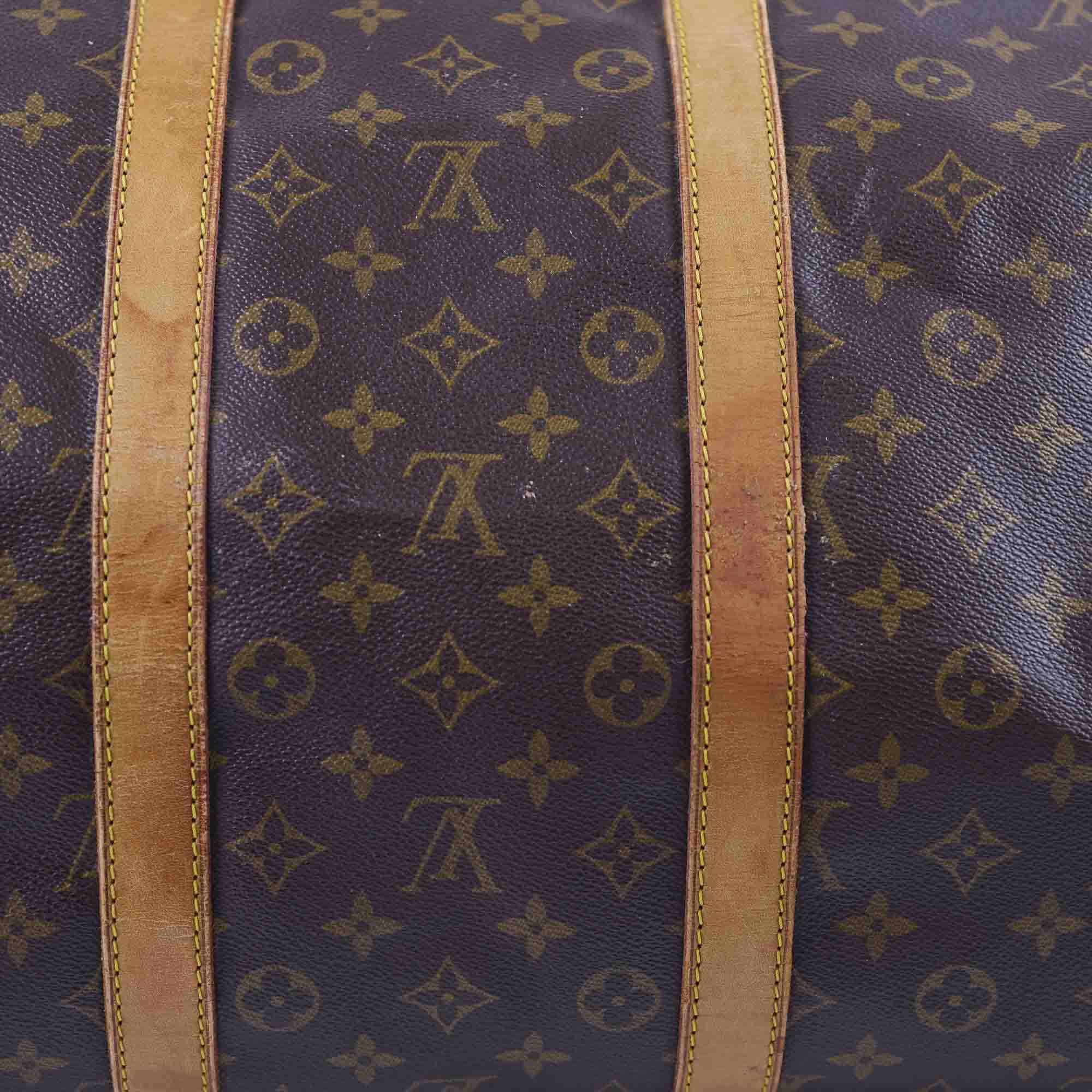 Signs of wear throughout, tarnish on hardware, darkening on vachetta leather, marks on the exterior canvas, clean interior